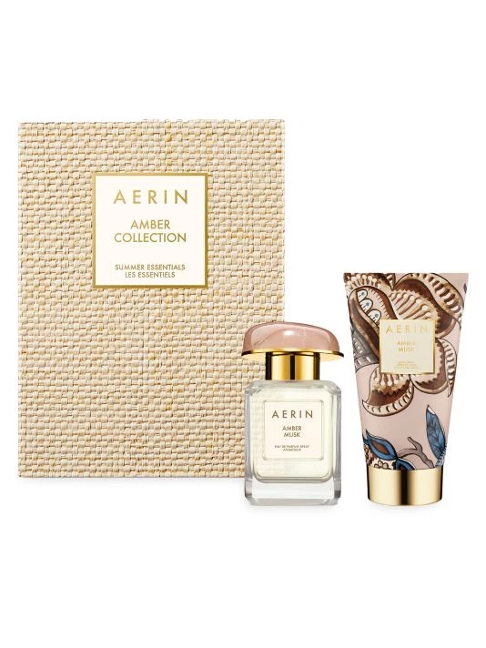 Warm and romantic, AERIN’s bestselling Amber Musk evokes cozy nights by the fire wrapped in a cashmere blanket. Presented in a carton with a raffia-themed panel, the set comes with an Eau de Parfum and a luxurious body cream nestled inside an AERIN-branded suede keepsake pouch. Made in USA.