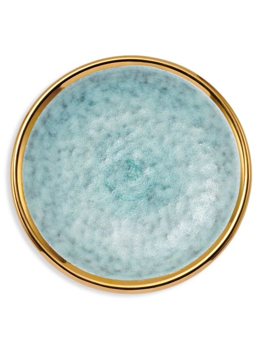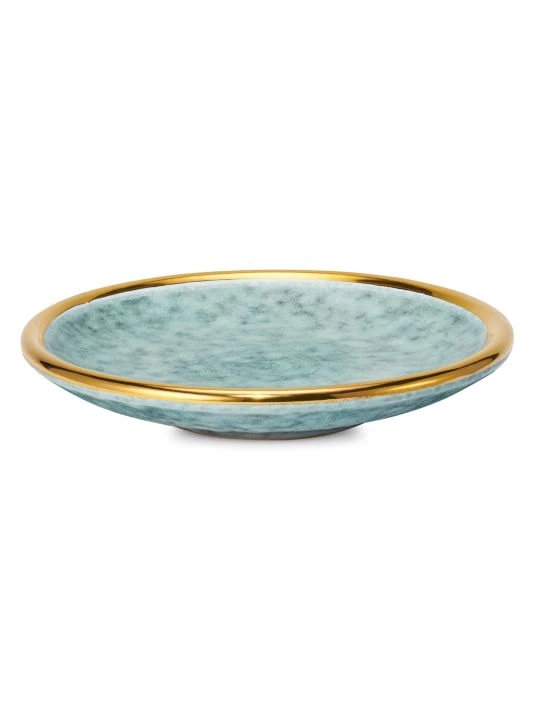 From the Calinda Collection. This hand-thrown vide poche by AERIN features a glazing technique that provides a textured appearance for artisanal appeal. It is finished with hand-painted gold detailing.