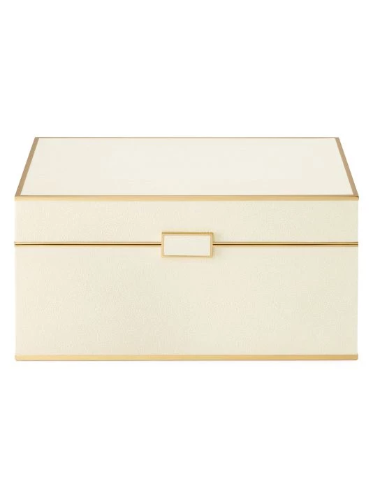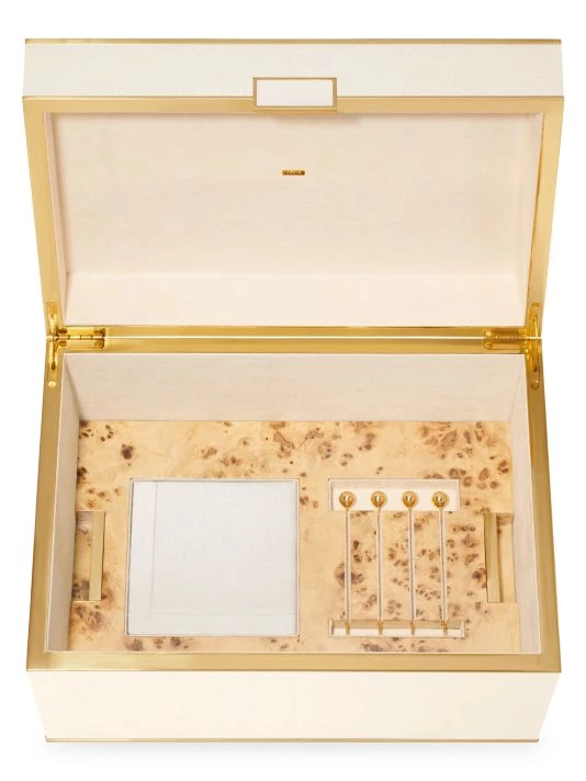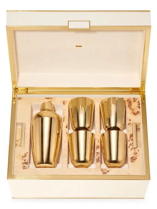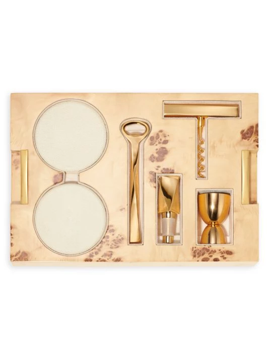 Beautifully stored in a shagreen box with brass hardware, this deluxe set has three removable trays with integrated brass handles. It includes everything you need for a home bar: a selection of Leon bar tools and serving accessories. Embossed shagreen/brass/suede. Wipe clean. Imported
