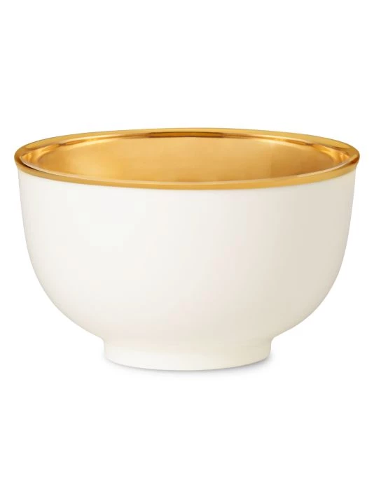 The Elia Bowl is part of a collection of simply elegant dinnerware with a wide rim that beautifully enhances the minimalist design. The light bowl exterior is further elevated by a hand-applied gold interior.