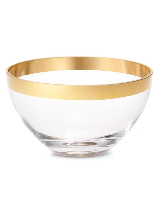 From the Gabriel Collection. A large glass bowl enhanced with a wide, hand-painted gold band at the rim. Beautifully shaped, it adds a touch of sophistication to a tabletop, and is a stylish way to serve snacks and candy when entertaining.