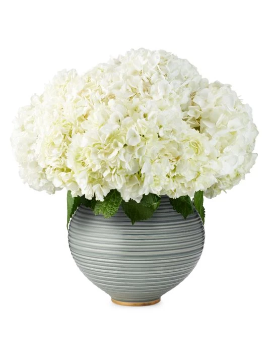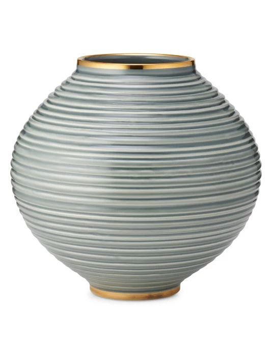 From the Fall 2021 Introduction Collection. This Adirondack and foliage inspired collection focuses on colored glass and jewel tones. Color extention of the original Calinda Moon Vase. Elevated by a hand-painted gold rim, it adds character to a table arranged with full blooms, such as hydrangeas.
