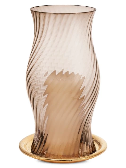 From the Fall 2021 Introduction Collection. This Adirondack and foliage inspired collection focuses on colored glass and jewel tones. Inspired by vintage glass color and the dimmed light that comes out of it, this smokey taupe colored hurricane creates a soothing mood in any setting.