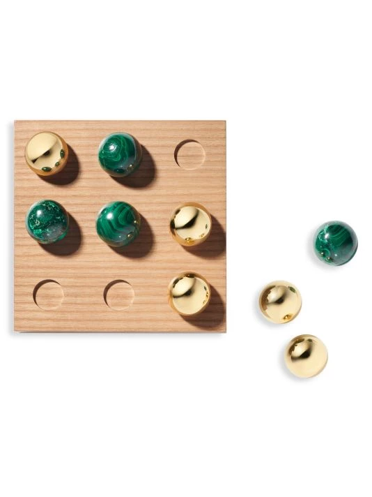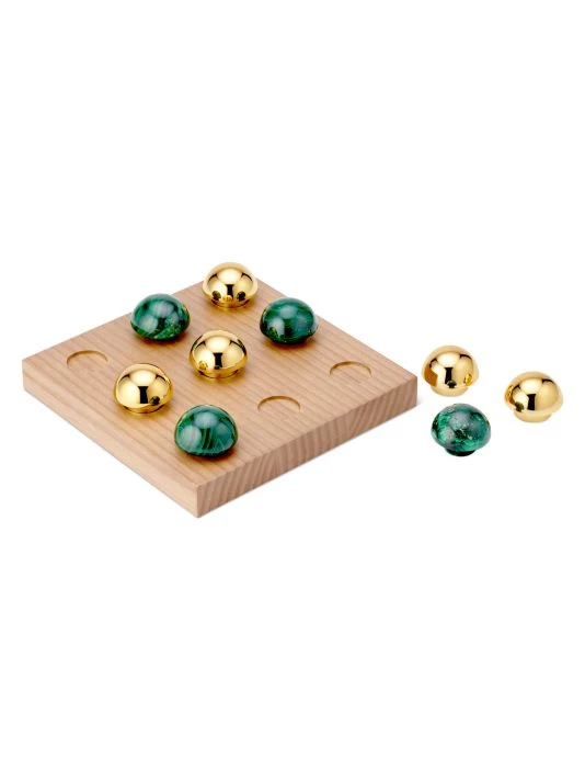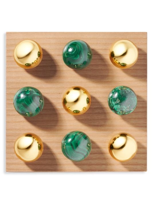 From the Fall 2021 Introduction Collection. This Adirondack and foliage inspired collection focuses on colored glass and jewel tones. Sculptural and decorative tic tac toe elements in malachite and brass. Lined with faux suede at the bottom of all pieces with gold stamp logo.