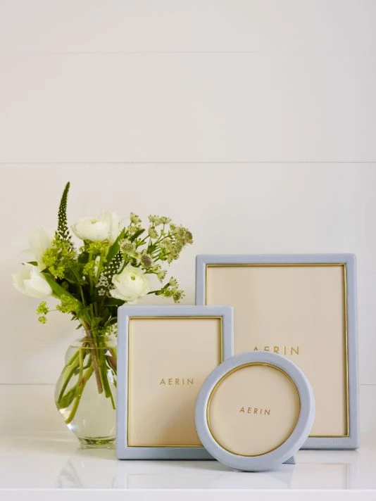 Boasting a subtle brass trim, this frame is crafted of smooth leather, adding a casual yet sophisticated touch.