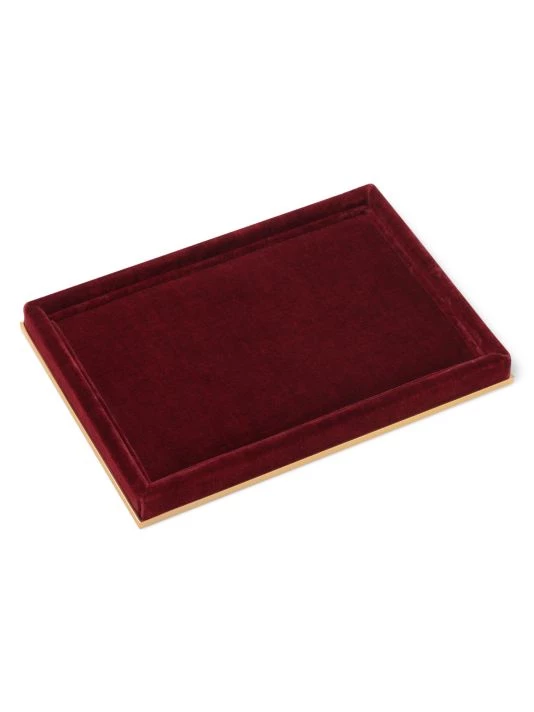 A versatile tray in luxurious velvet further enhanced with brass edging. It is a beautiful addition to a vanity for jewelry and personal items or to keep a desk organized.