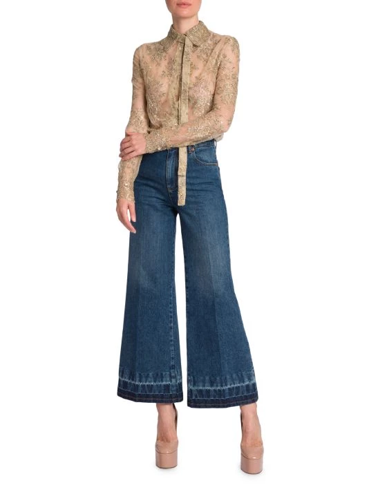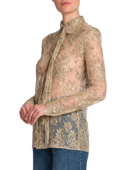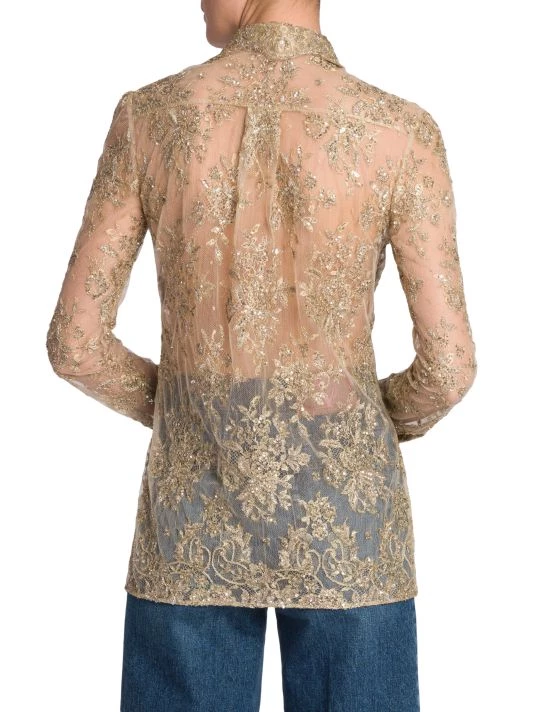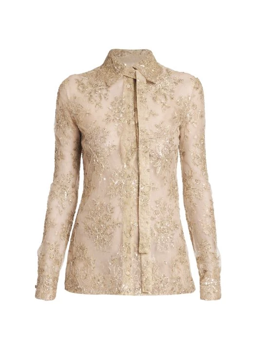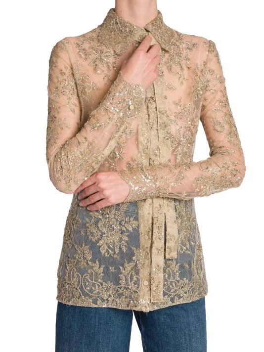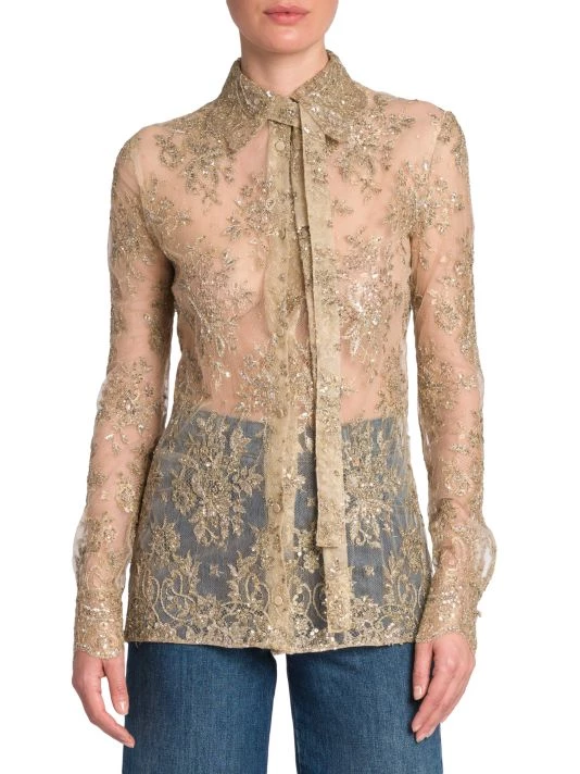 Valentino’s sheer lace top is defined by a self-tie neck and beaded floral embroidery.