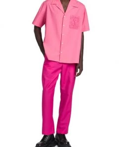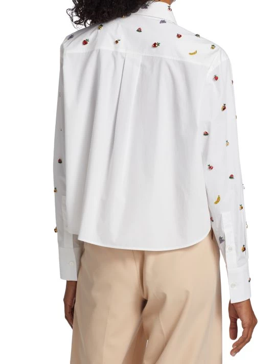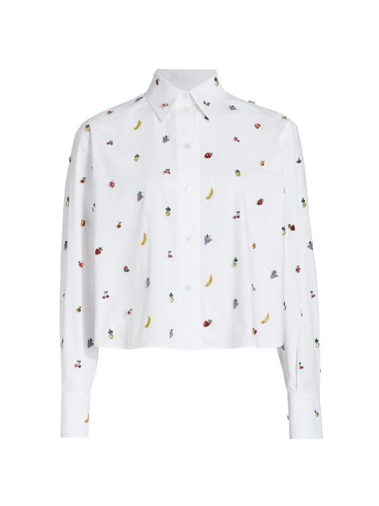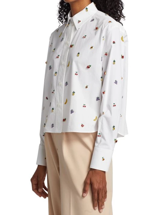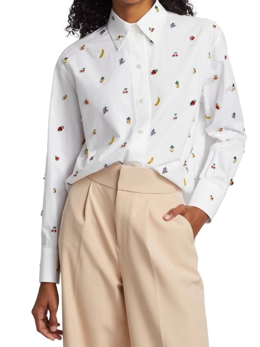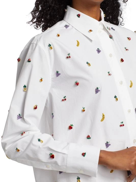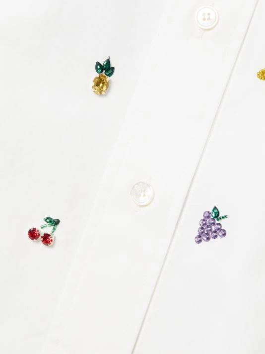 Adorned with a beaded fruit motif, this crisp cotton shirt evokes a whimsical aesthetic.