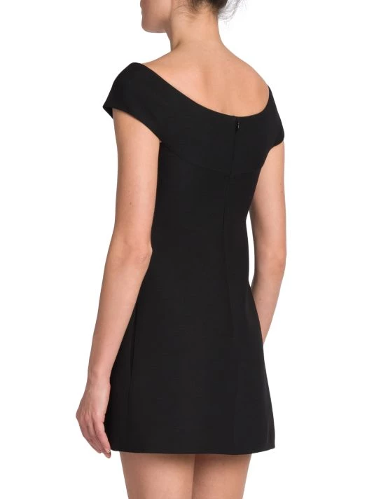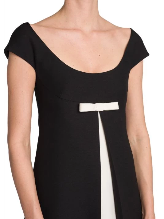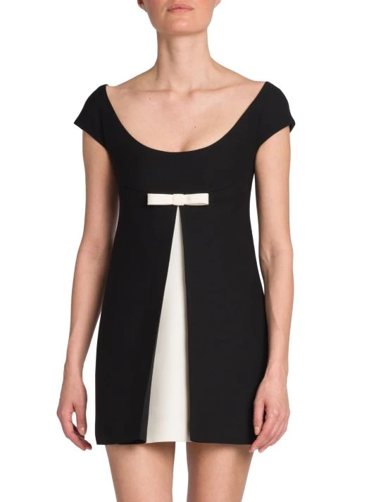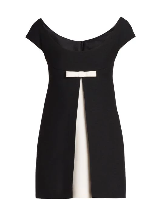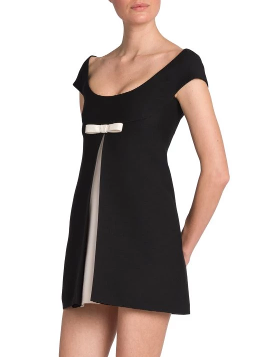 Valentino’s crepe couture minidress is defined by a contrast bow-embellishment at the chest and dimensional front vent.