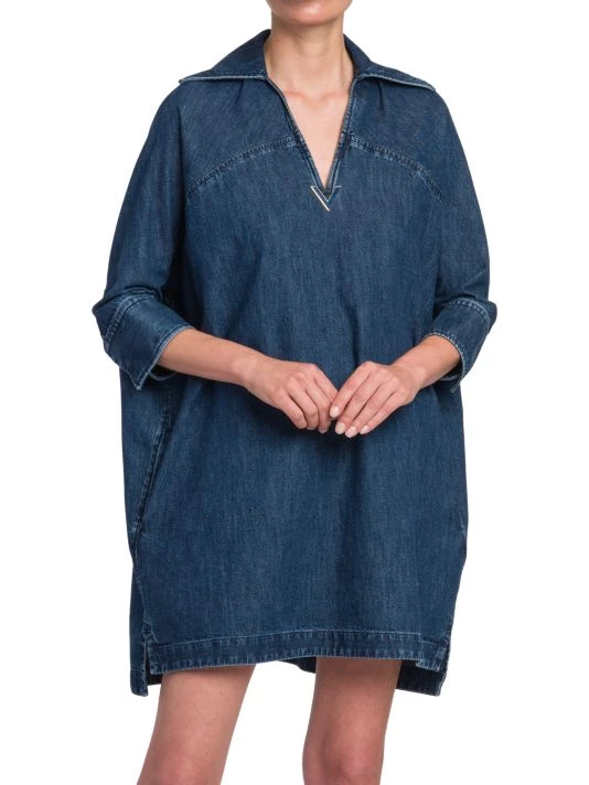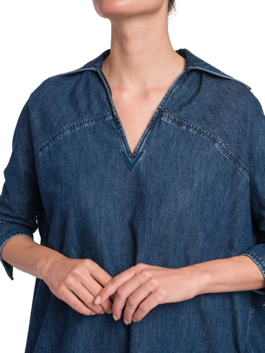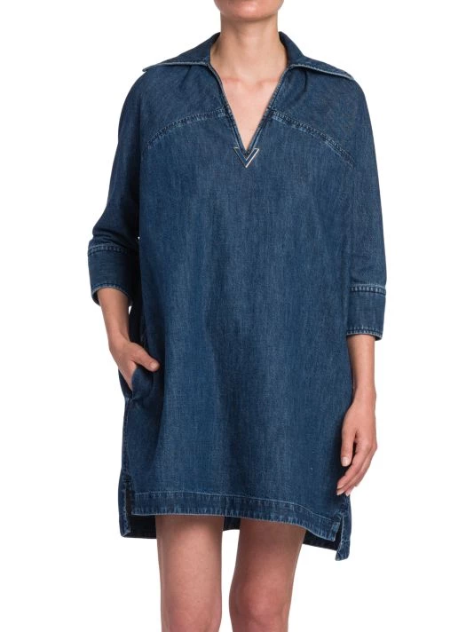 Boxy denim mini-dress with a tonal metal logo at V-neck.