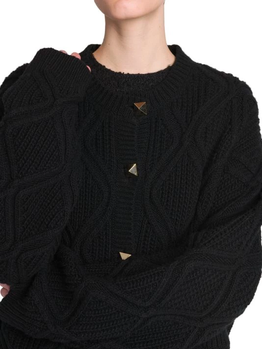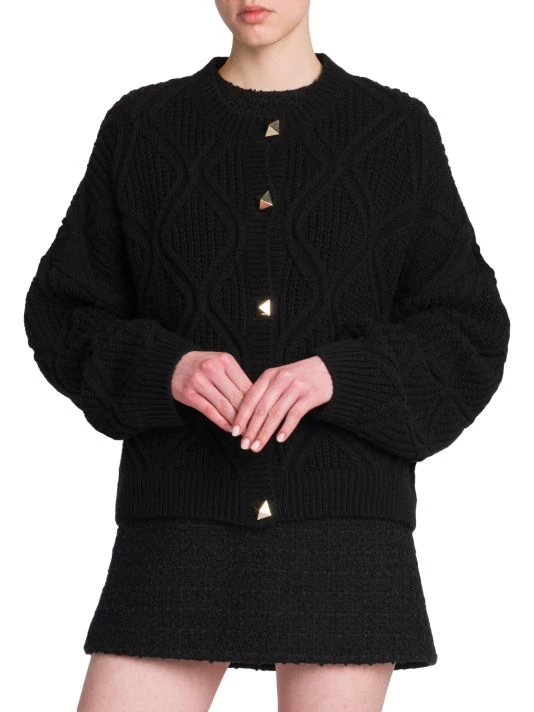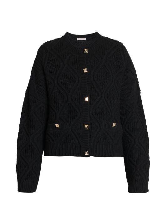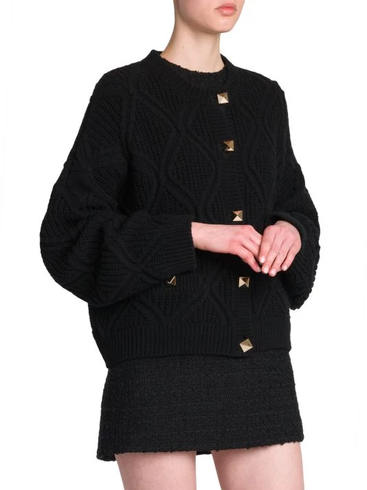 Knit from virgin wool and cashmere, Valentino’s boxy cardigan is elevated by geometric goldtone button embellishments.