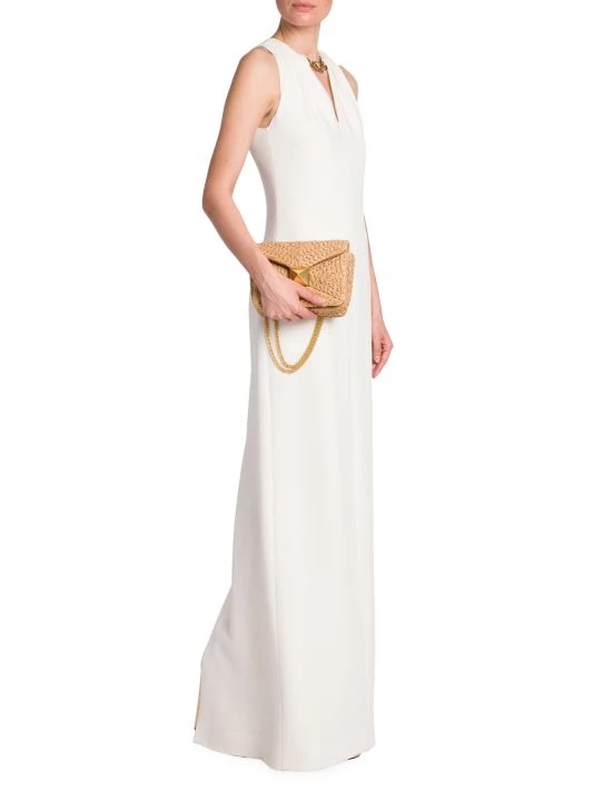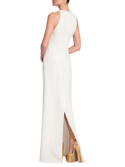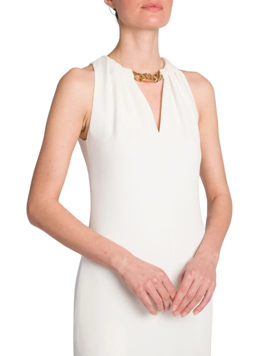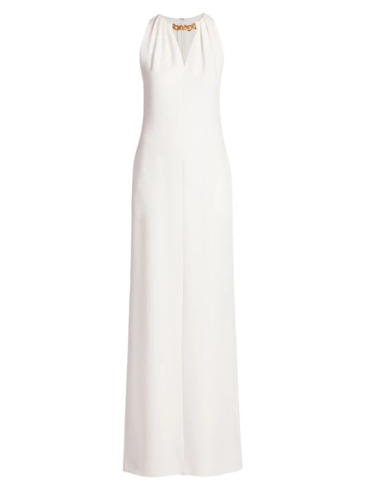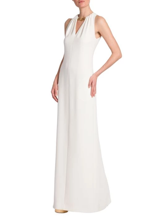 Valentino’s sleeveless Cady Couture gown is elevated by a goldtone chain-embellished V-neck and high back slit.