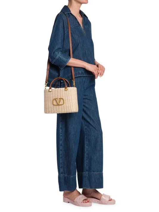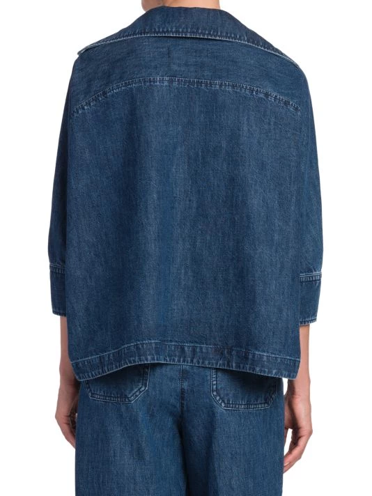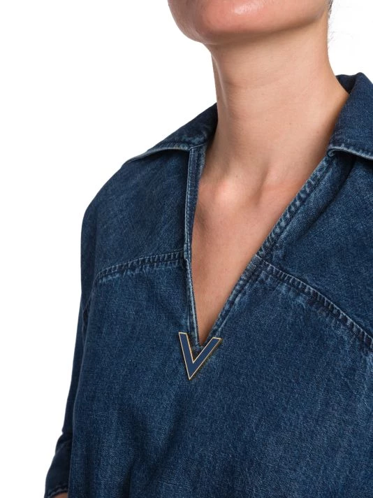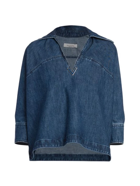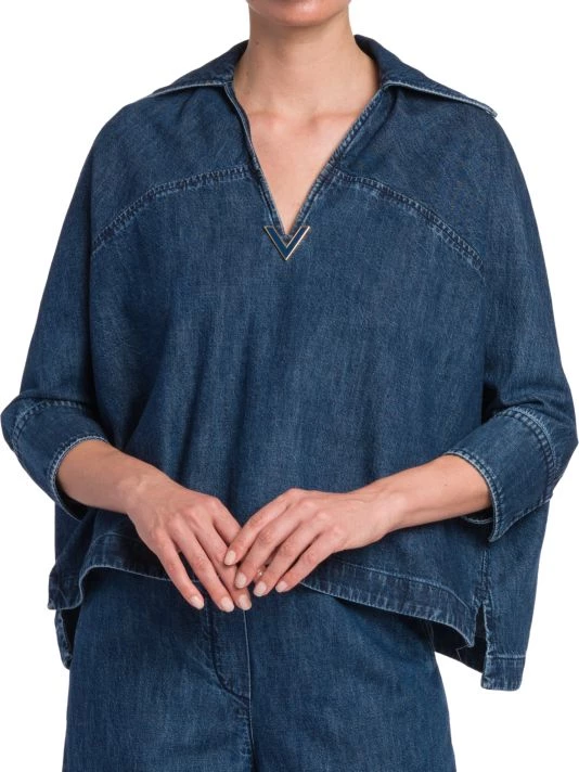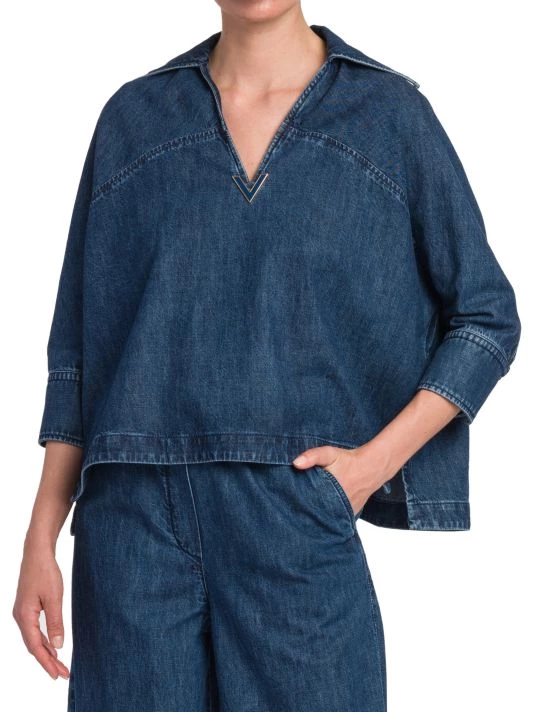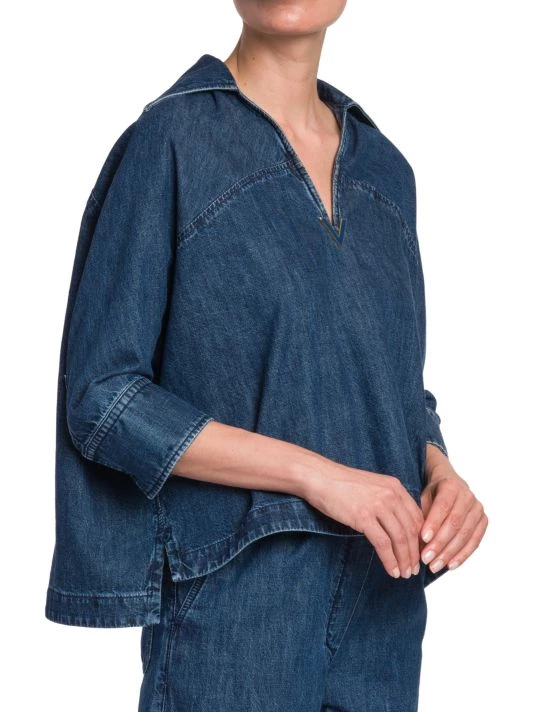 Boxy denim pullover top with a tonal metal logo at V-neck.