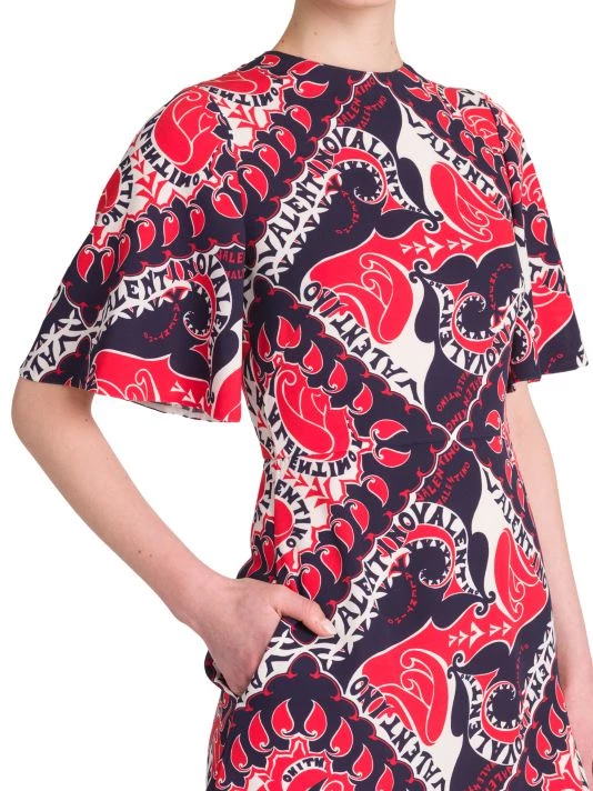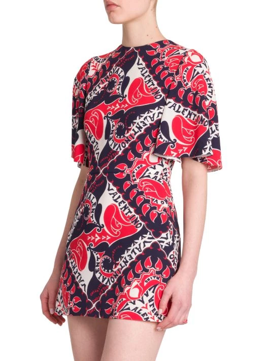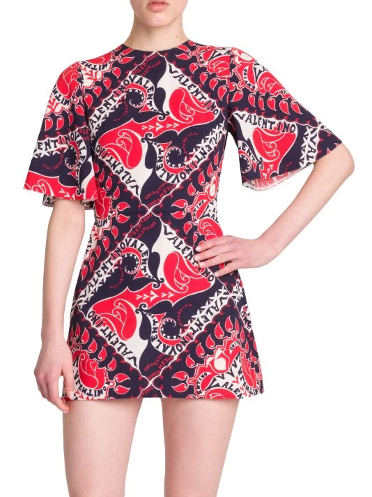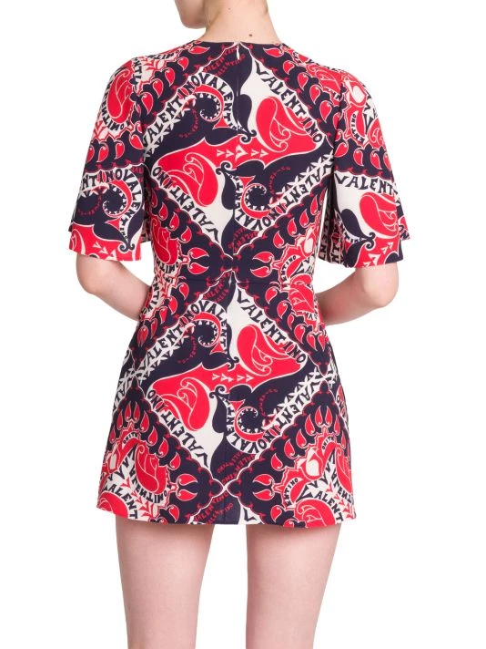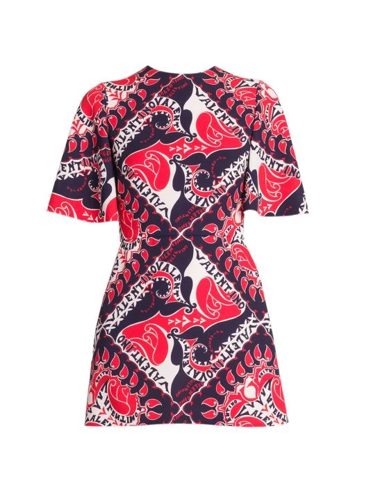 Crafted of a luxe crepe de chine, Valentino’s short-sleeve minidress is elevated by mixed abstract and logo prints.
