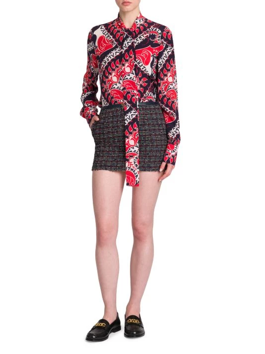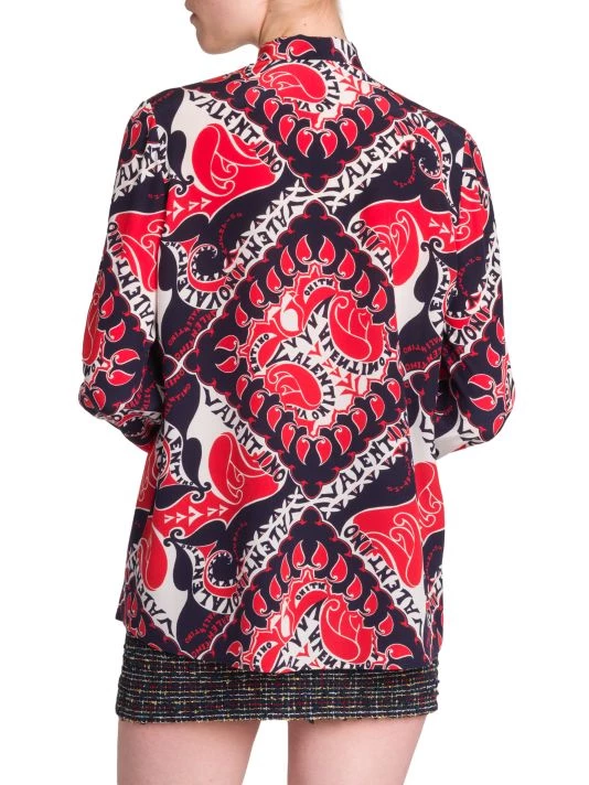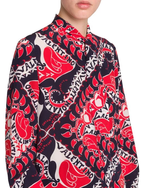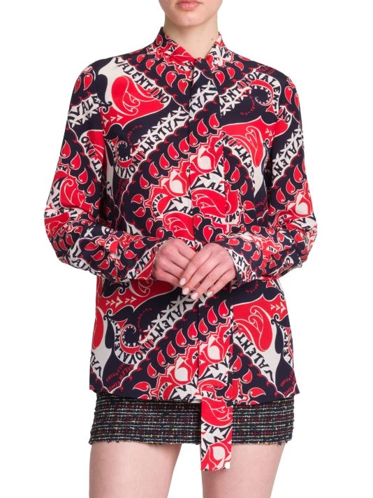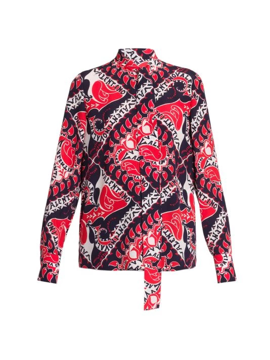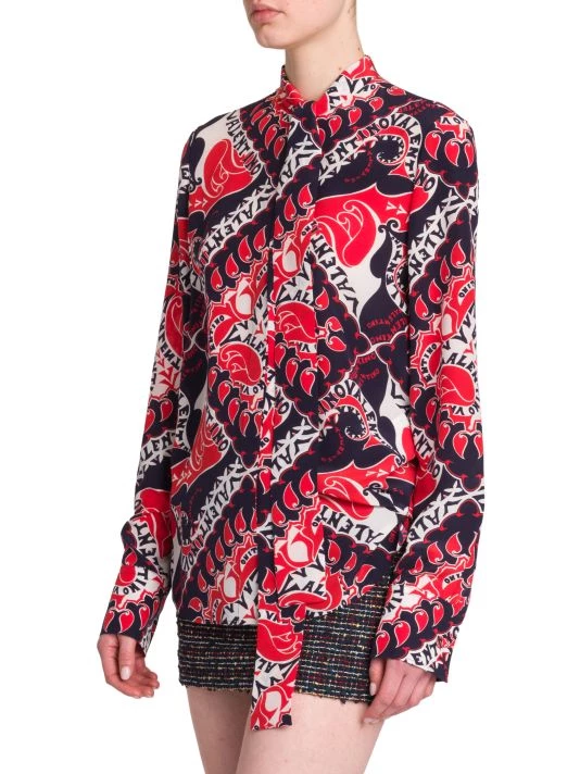 Crafted of crepe de chine, Valentino’s tie-neck blouse is elevated by mixed abstract and logo prints.