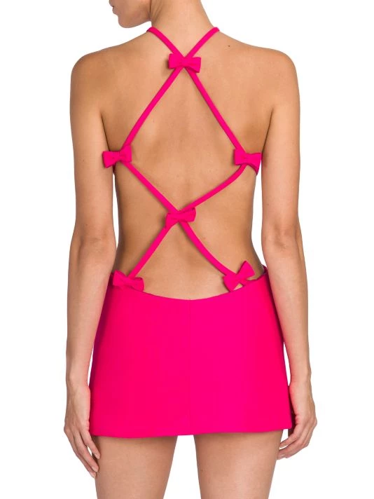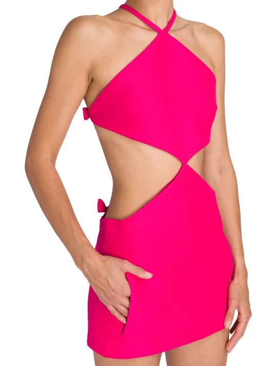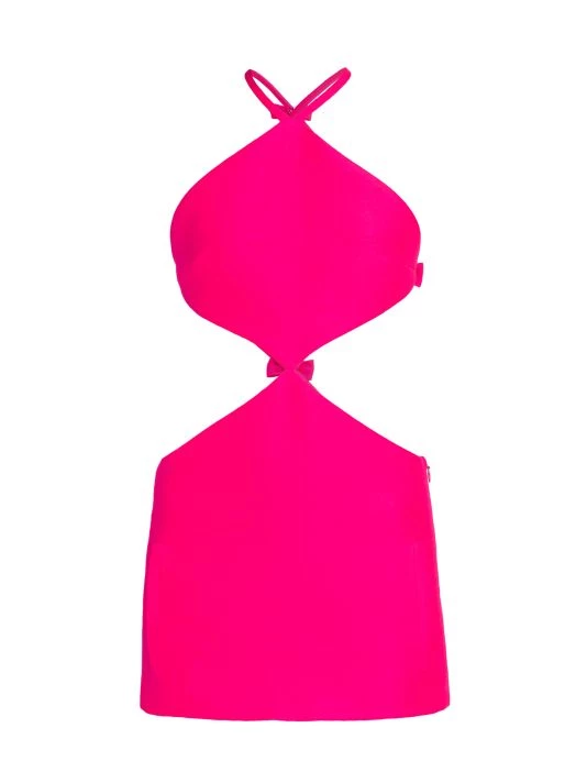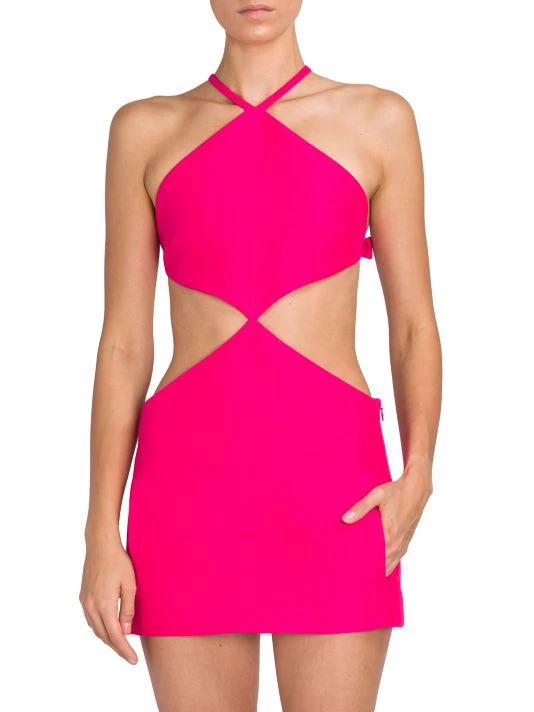 Valentino’s creative director Pierpaolo Piccioli plays with an electric palette, billowing silhouettes, and silk fabrics in his most recent collection. With an obvious ode to the label’s history, Piccioli blends embroidery, micro-shorts, and gender-fluidity into garments that successfully speak to both tradition and Gen Z. This formfitting minidress has mirrored cut-outs at the waist and a sharp halterneck.