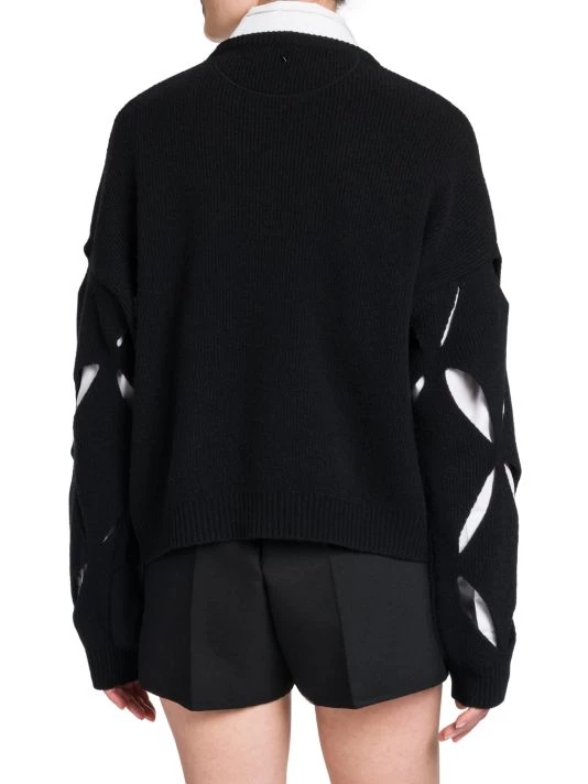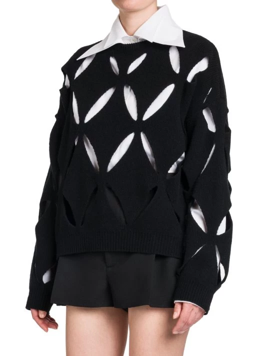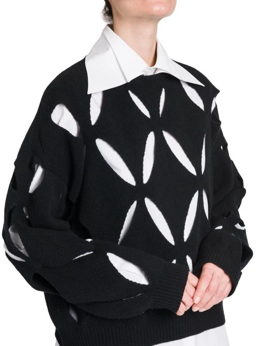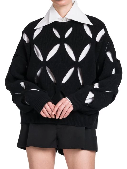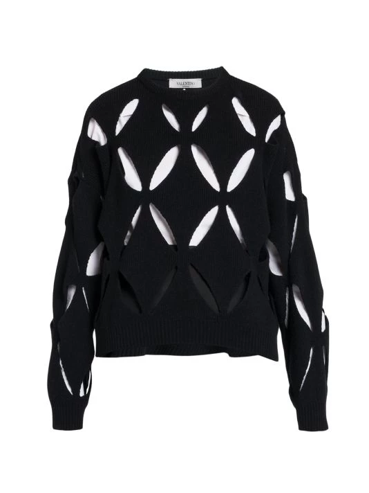 Openwork virgin wool crewneck sweater with abstract cutouts and contrast rib trim.