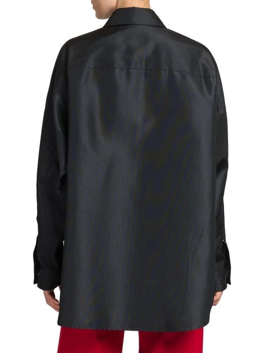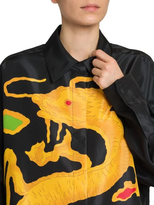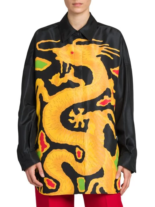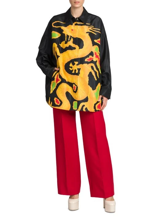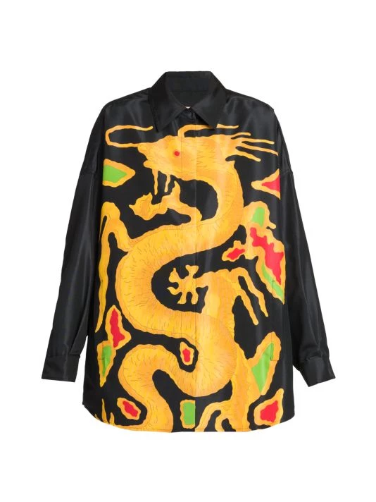 Creative Director Pierpaolo Piccoli’s latest collection expresses a delicate balancing act of furthering the house’s couture legacy with the gen-Z zeitgeist. From an embroidered robe highlighting Valentino’s storied handcraftsmanship to archival prints refreshed for a tracksuit, the visionaire reinvents Valentino hallmarks to “to be relevant for a community of people…who inhabit fashion with an attitude of personal creativity.” Sporting an oversized silhouette, this flowing shirt catches the eye with a striking dragon motif. This garment is crafted of a cotton-silk faille producing a subtle sheen with each movement.