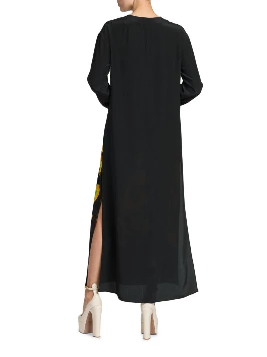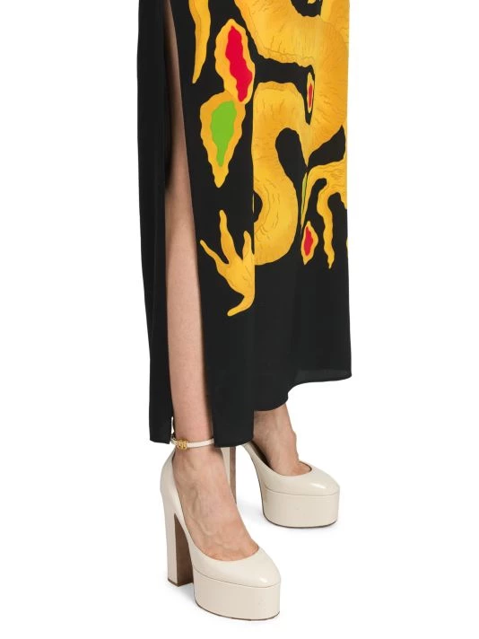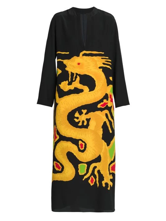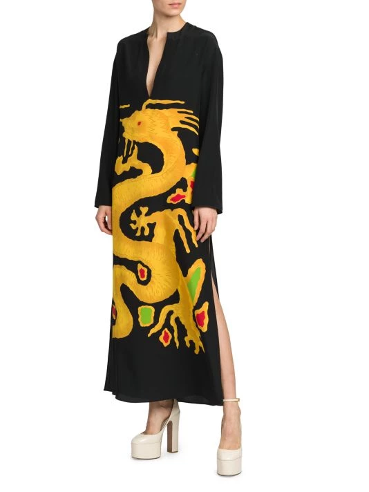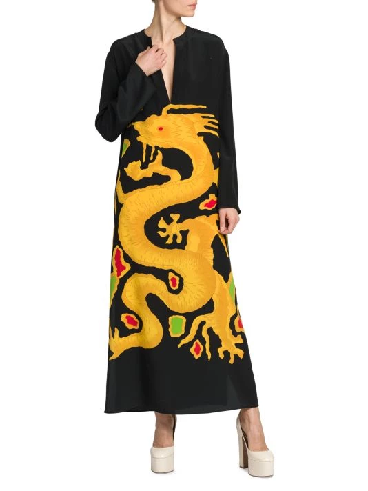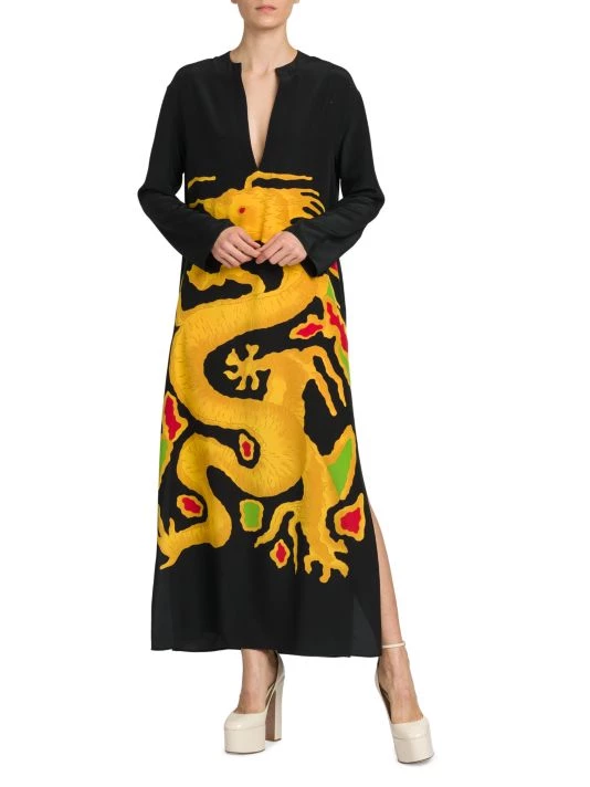 Creative Director Pierpaolo Piccoli’s latest collection expresses a delicate balancing act of furthering the house’s couture legacy with the gen-Z zeitgeist. From an embroidered robe highlighting Valentino’s storied handcraftsmanship to archival prints refreshed for a tracksuit, the visionaire reinvents Valentino hallmarks to “to be relevant for a community of people…who inhabit fashion with an attitude of personal creativity.” Showcasing a stunning dragon motif, this maxi dress is crafted of a crepe de chine silk. This relaxed silhouette features a plunging V-neck and whispy side slits.