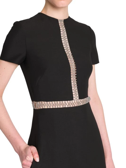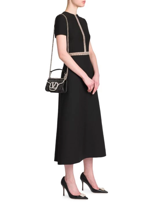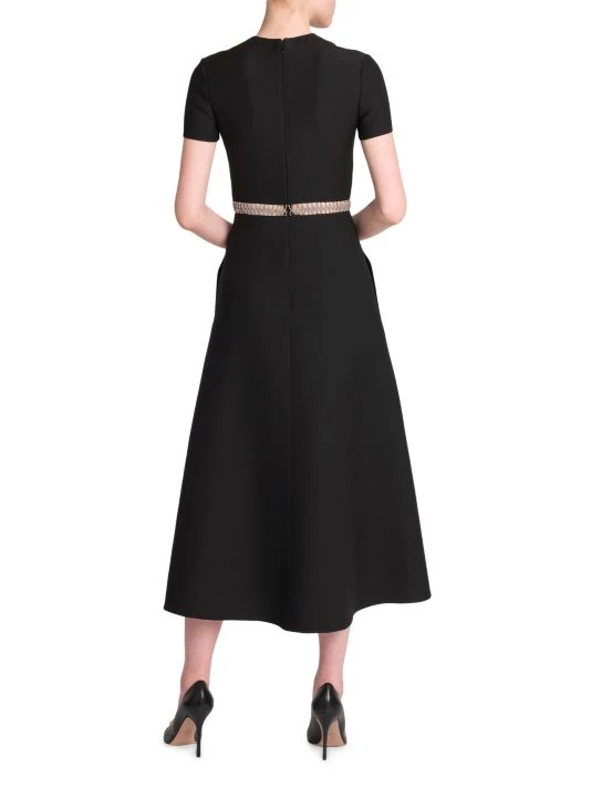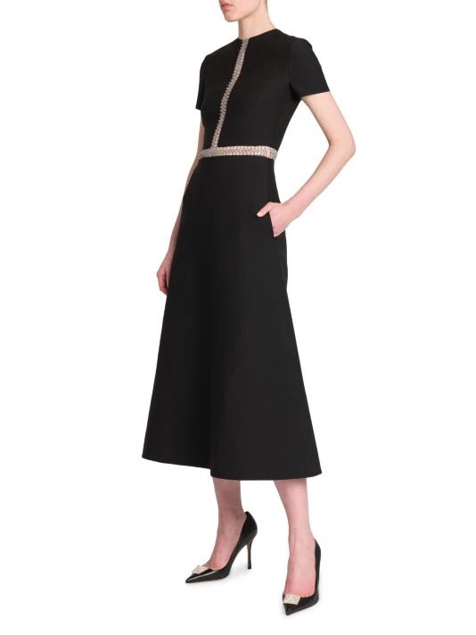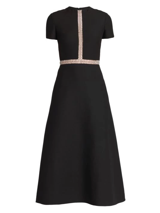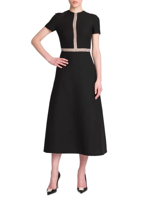 Valentino’s flared midi-dress features sheer bead-embroidered inserts at the bodice and waist.