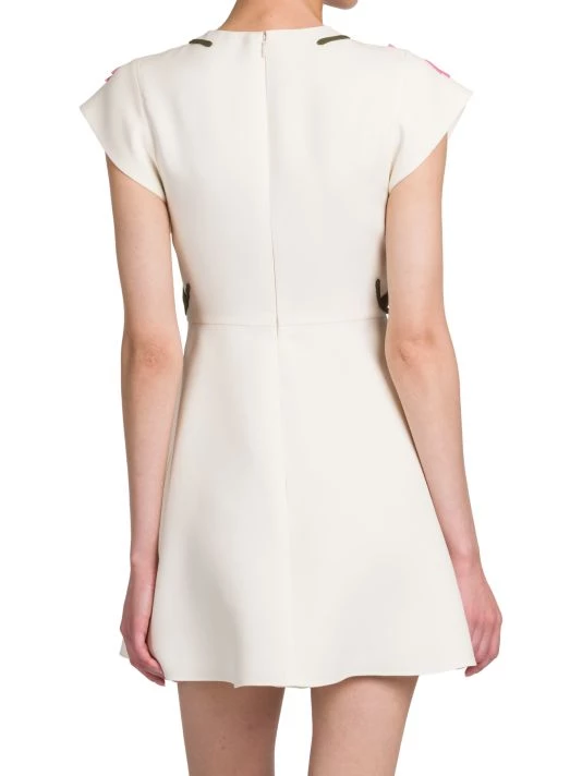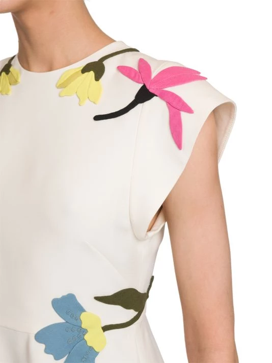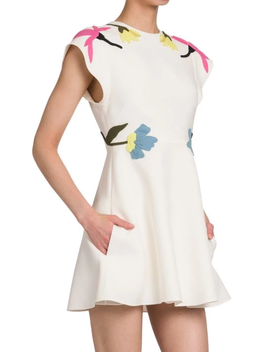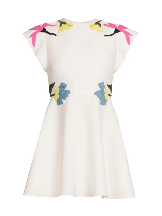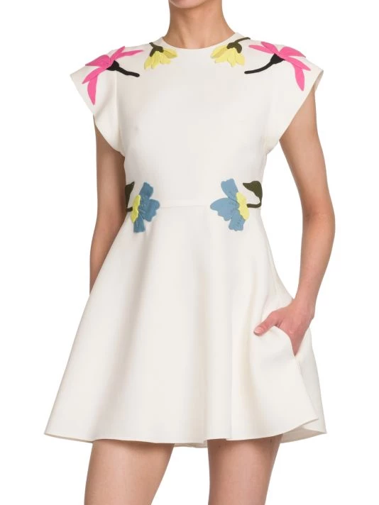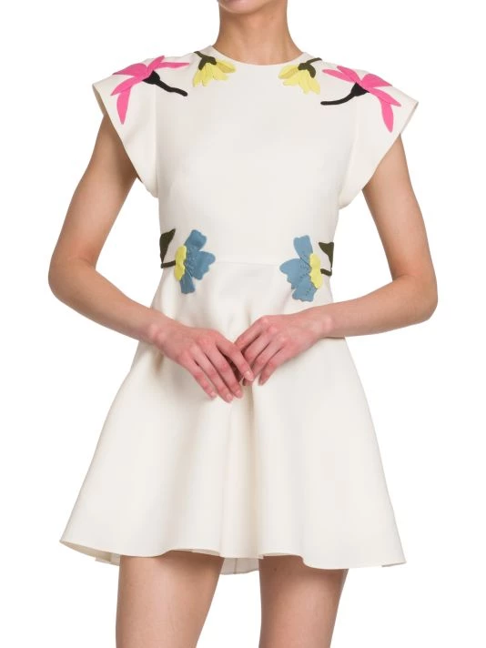 Wool-blend mini-dress with three-dimensional floral embellishments at front and a pleated peplum hem.