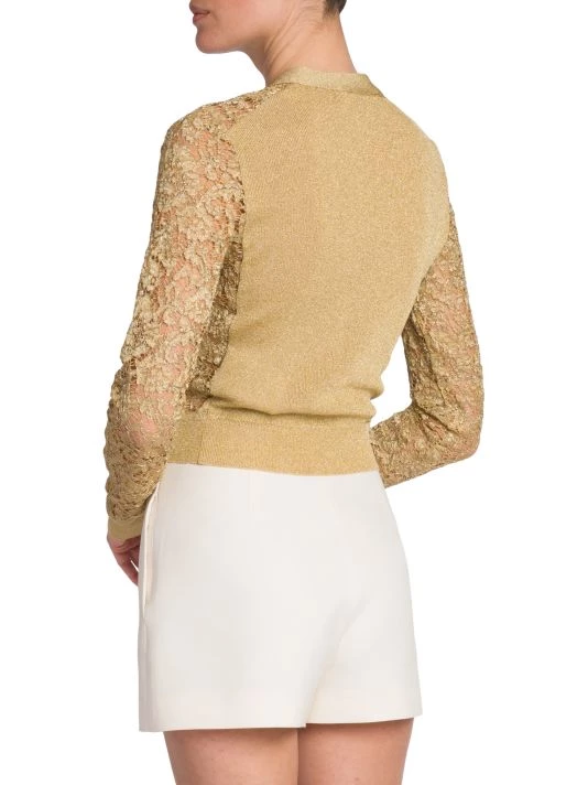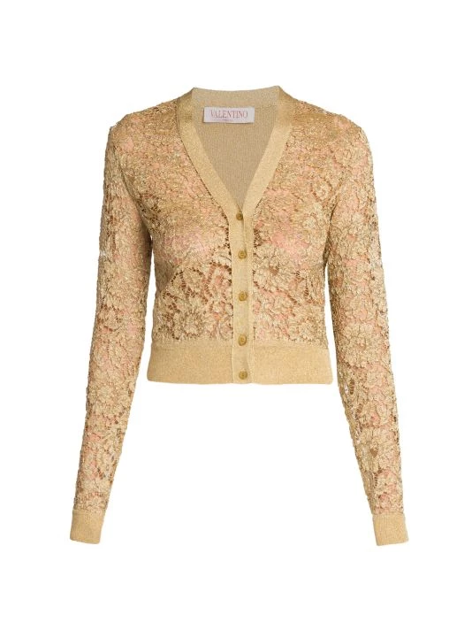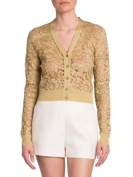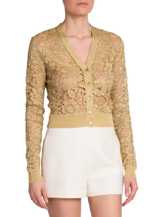 Valentino’s cropped cardigan is crafted of an intricate floral lace and a contrast glittery back.