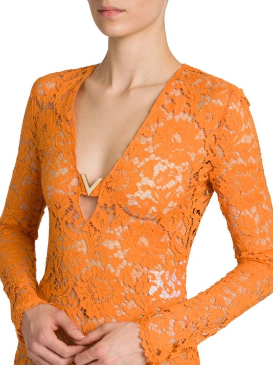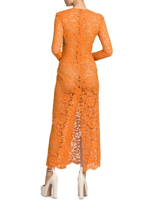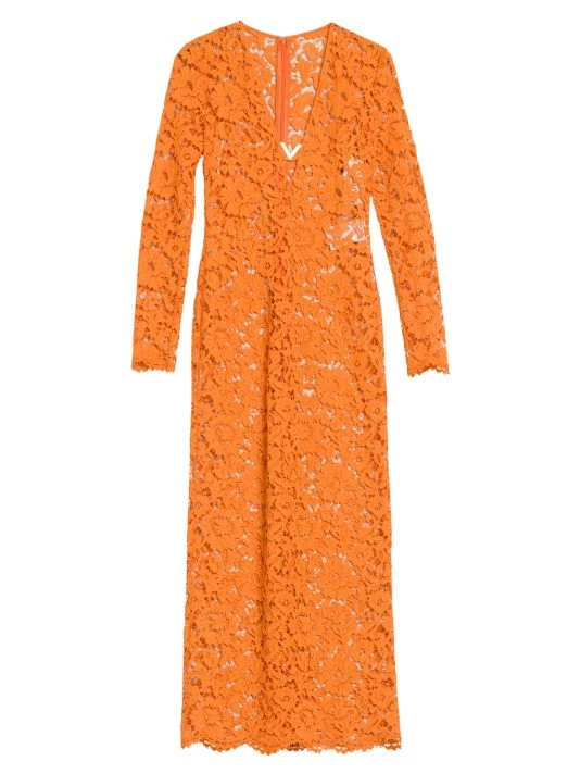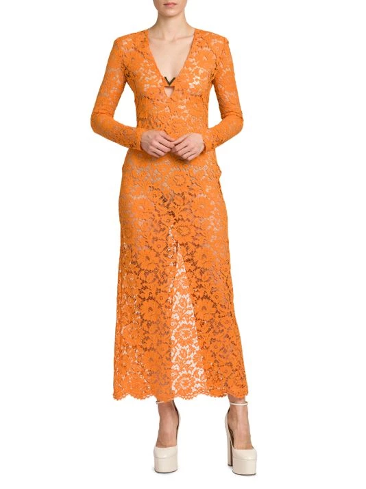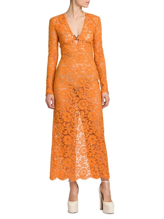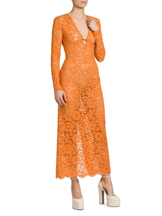 Creative Director Pierpaolo Piccoli’s latest collection expresses a delicate balancing act of furthering the house’s couture legacy with the gen-Z zeitgeist. From an embroidered robe highlighting Valentino’s storied handcraftsmanship to archival prints refreshed for a tracksuit, the visionaire reinvents Valentino hallmarks to “to be relevant for a community of people…who inhabit fashion with an attitude of personal creativity.” This elegant midi-dress is crafted of semi-sheer lace sporting a romantic floral motif. Cut with a sharp V-neck, this charming style ends in a scalloped hem.