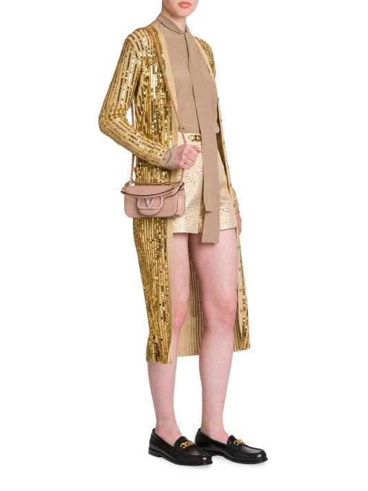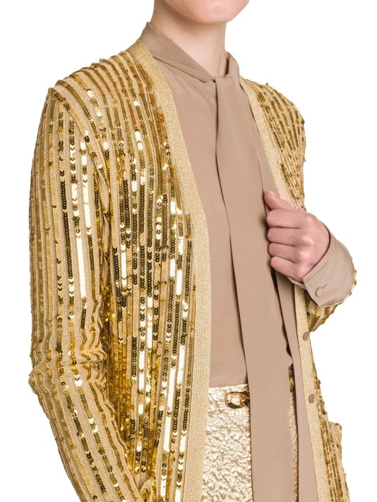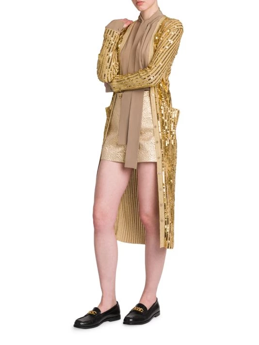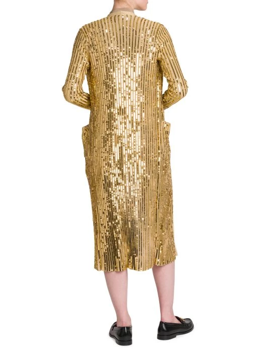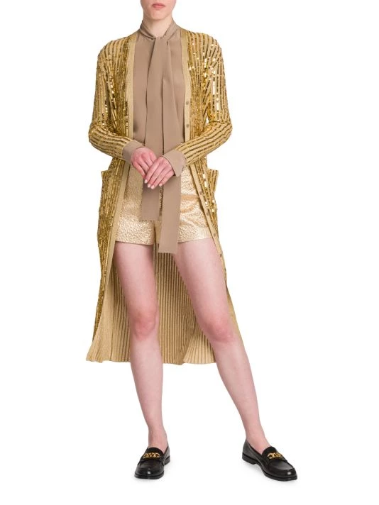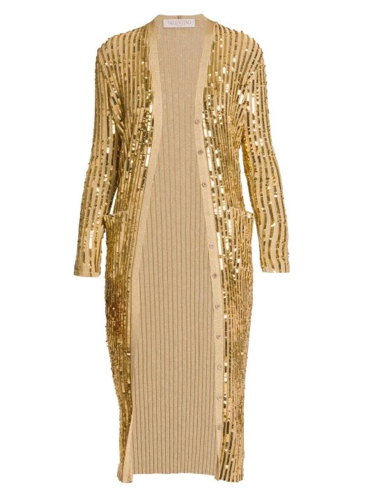 Valentino’s long cardigan is defined by lustrous sequin embroidery and a contrast banded glittery trim.