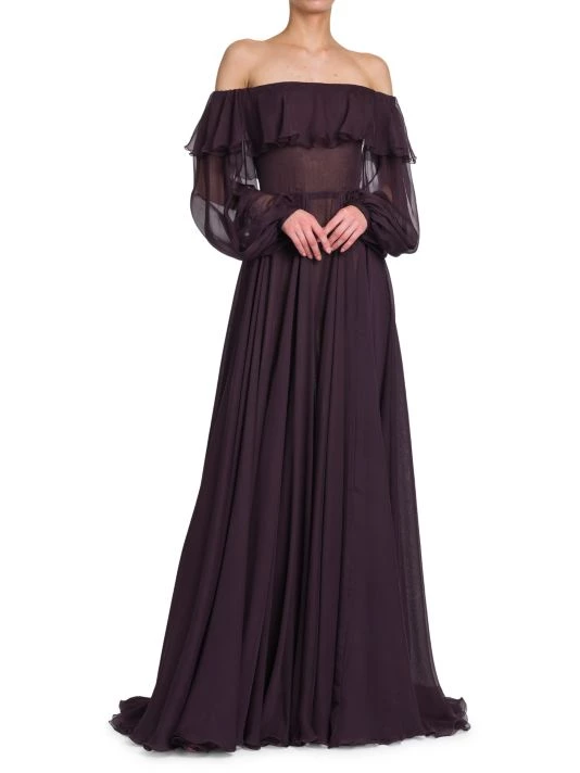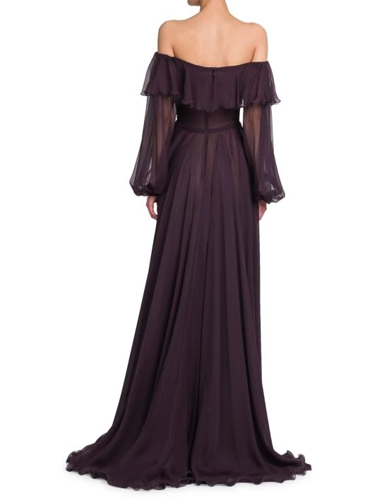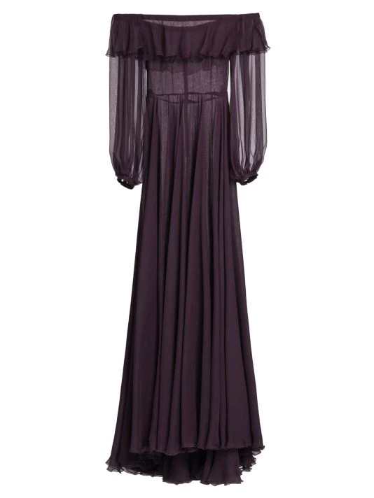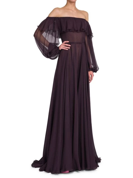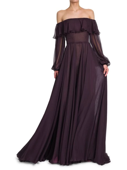Semi-sheer silk gown with an off-the-shoulder ruffle neckline and elegant trailing hem.