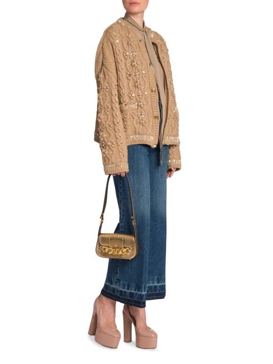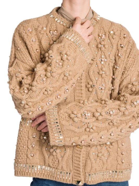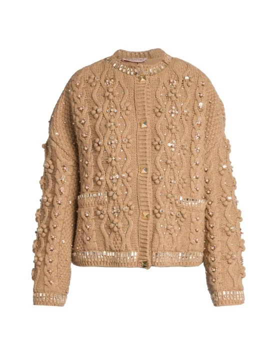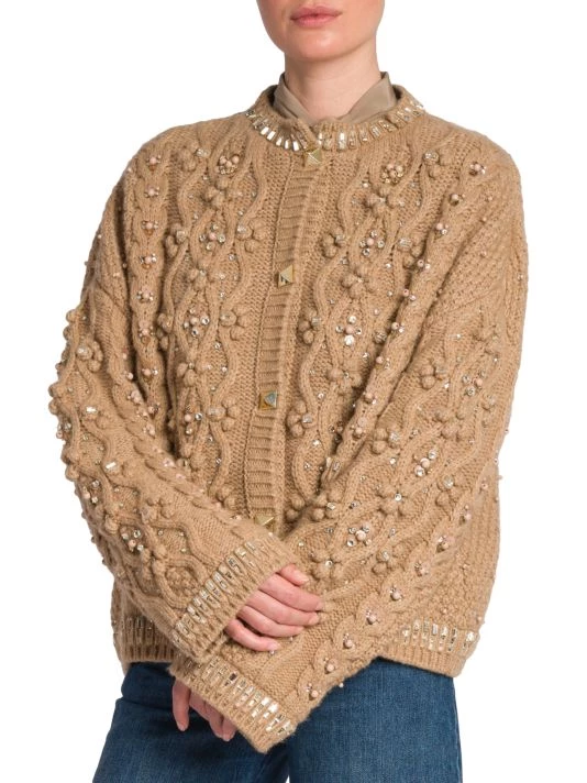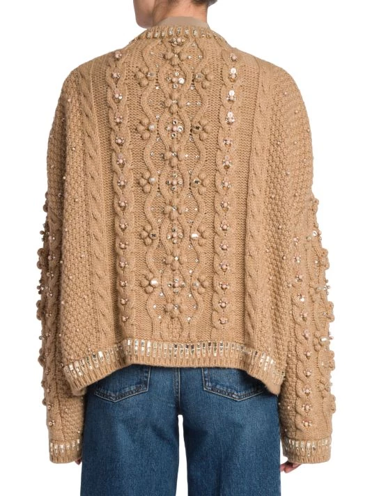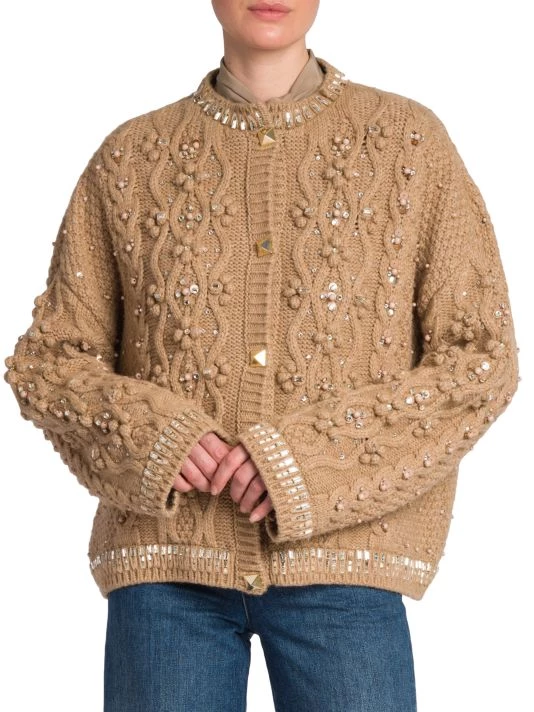 Valentino’s oversized cable-knit cardigan is enhanced by playful sequin and crystal embroidery.