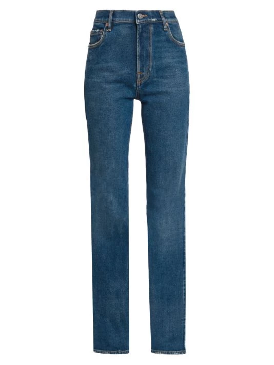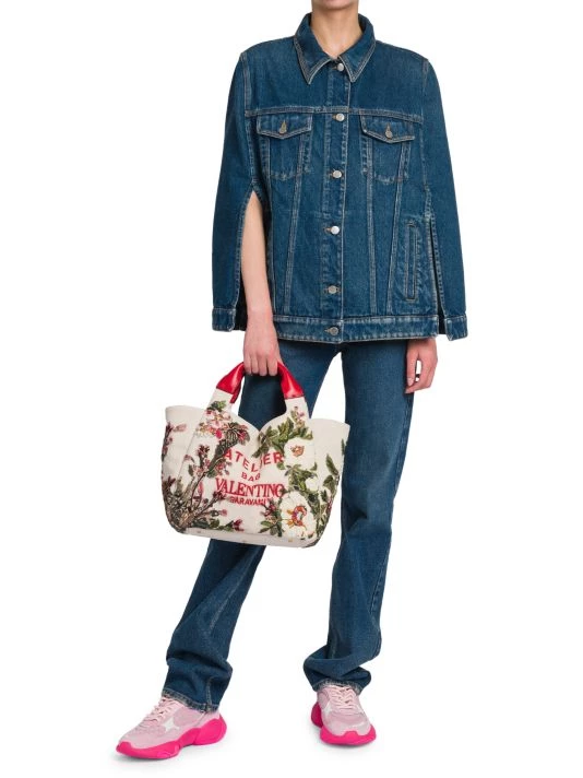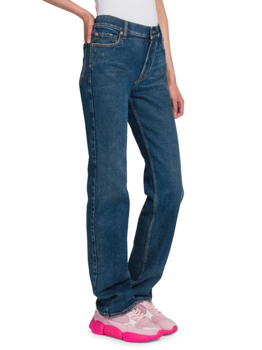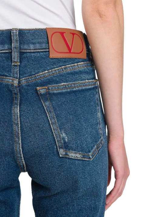 Valentino’s oversized straight-leg jeans are elevated by a contrast leather logo patch at the back.