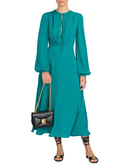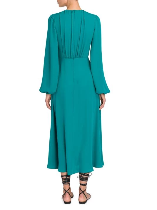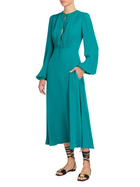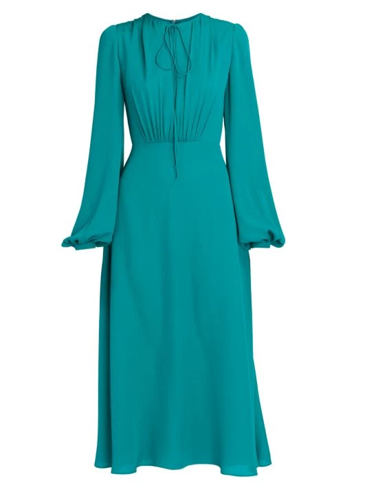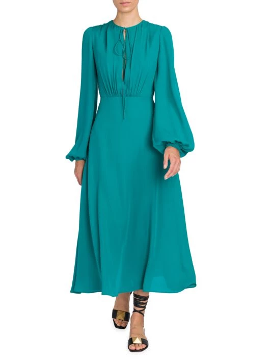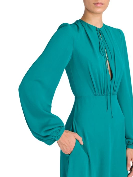 This flowing dress is crafted of Italian silk ties at the neck creating a slitted keyhole, adorned with soft pleats throughout the design.
