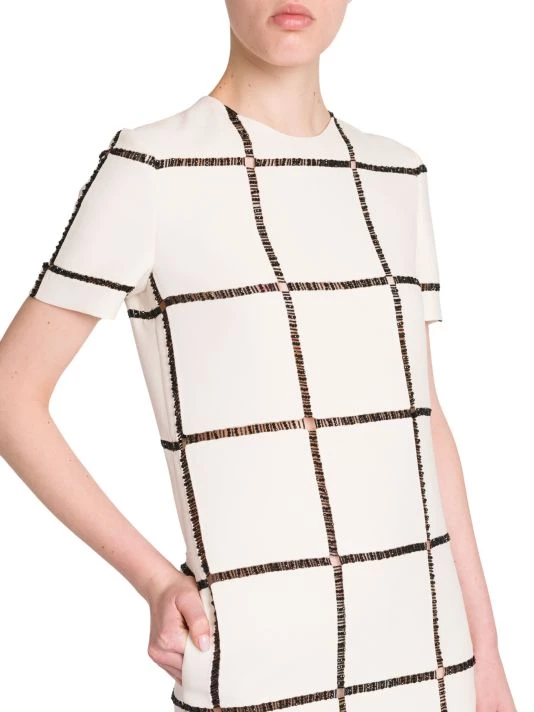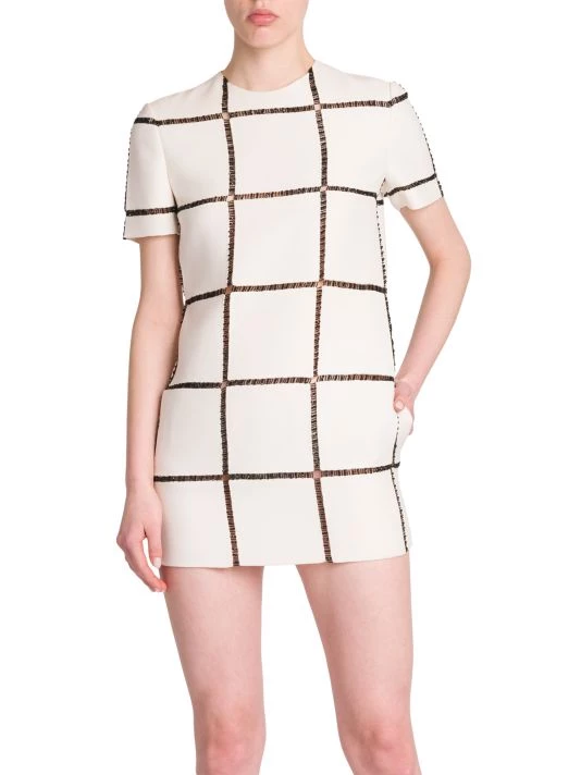 Valentino’s short-sleeve minidress is elevated by semi-sheer bead-embroidered patterning.