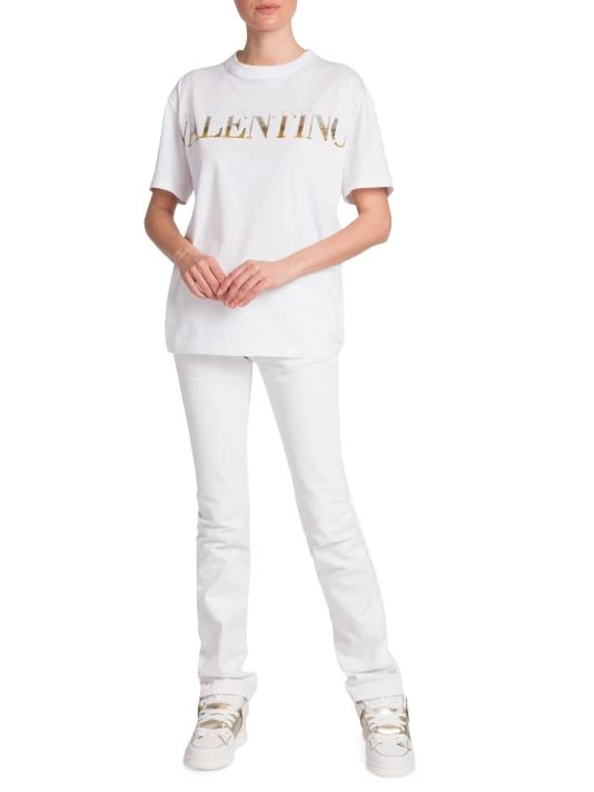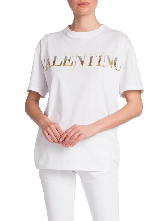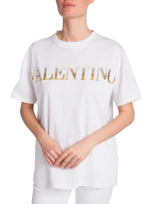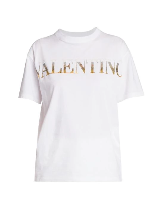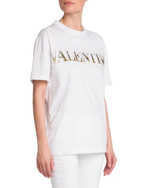 Valentino’s crewneck T-shirt is defined by an ombré, sequin-embroidered logo at the chest.