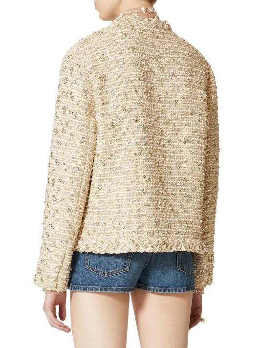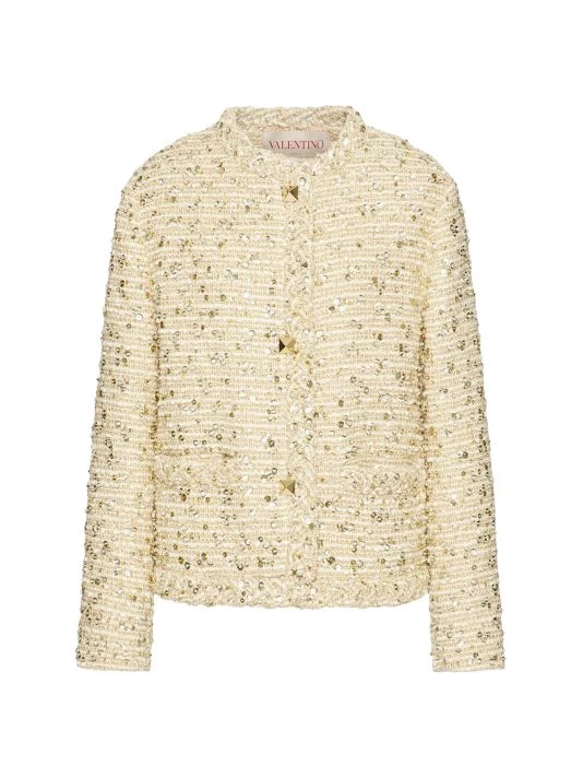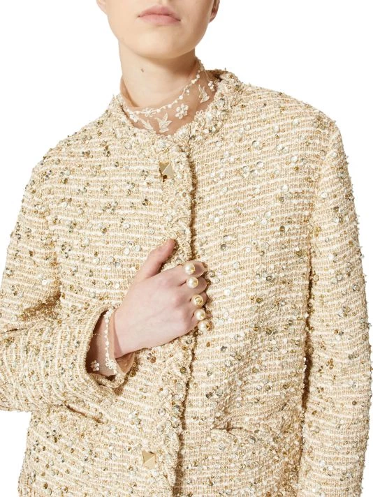 Crafted of tweed, Valentino’s button-front jacket is elevated by layered crystal and sequin embroidery.