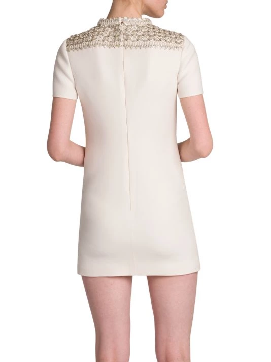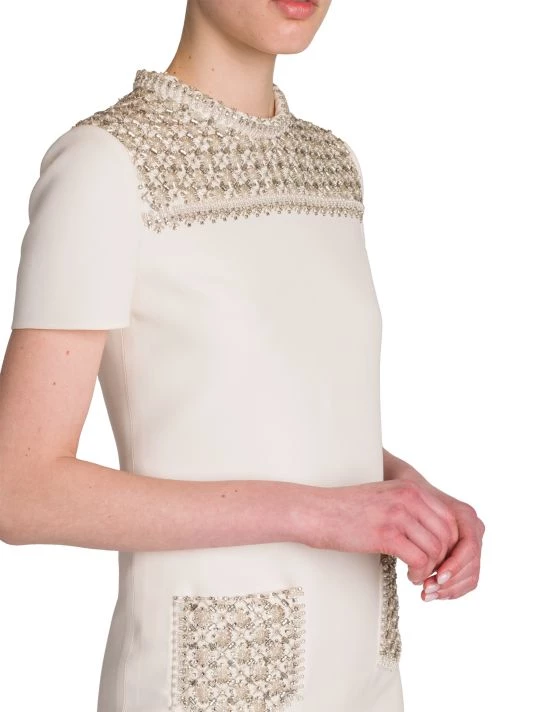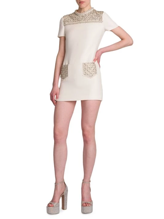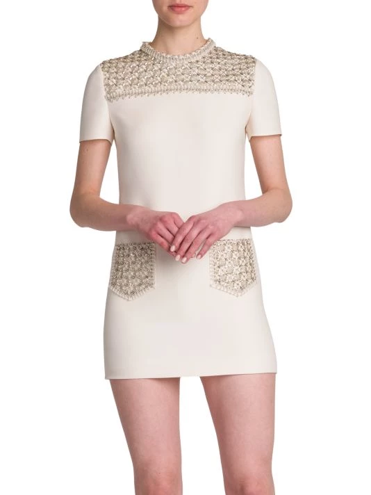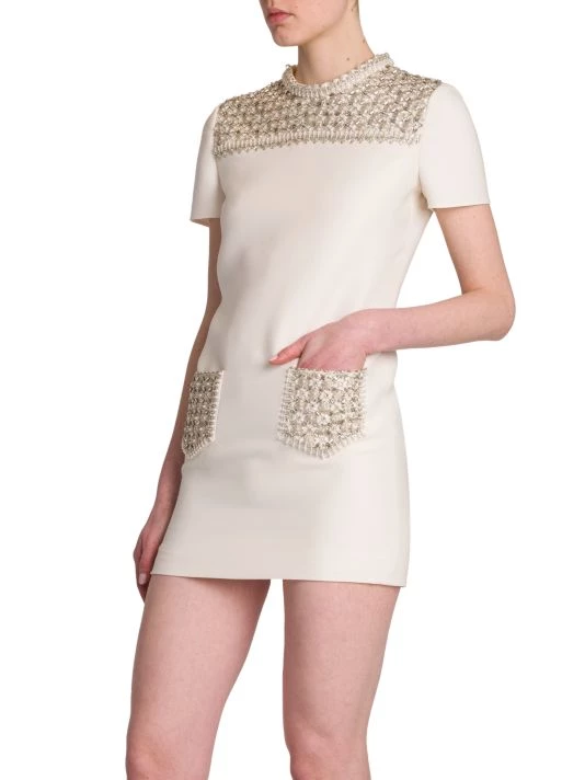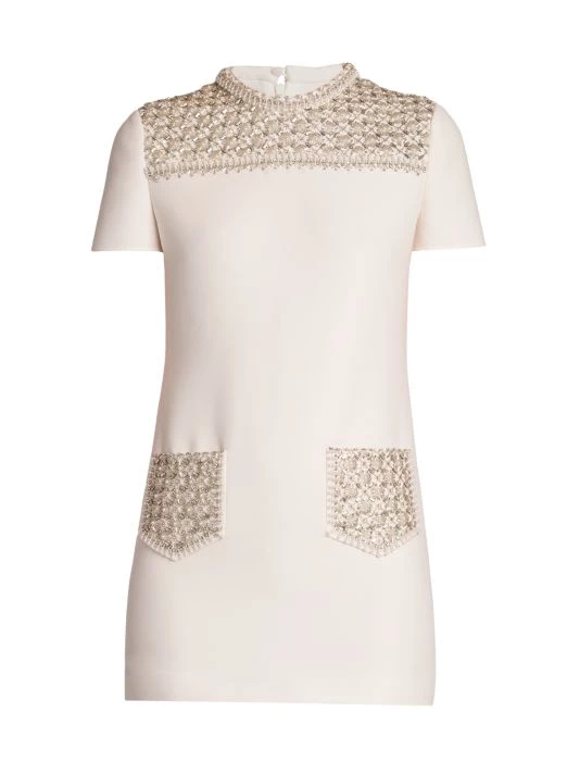 Crafted of a virgin wool and silk blend, Valentino’s short-sleeve minidress is elevated by intricate beading at the bodice and waist patch pockets.