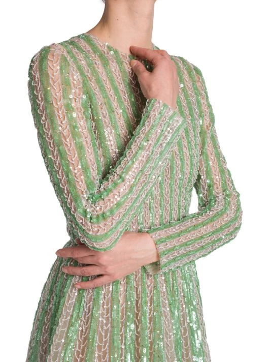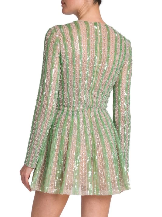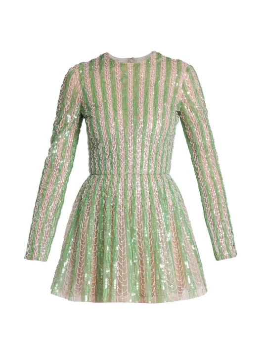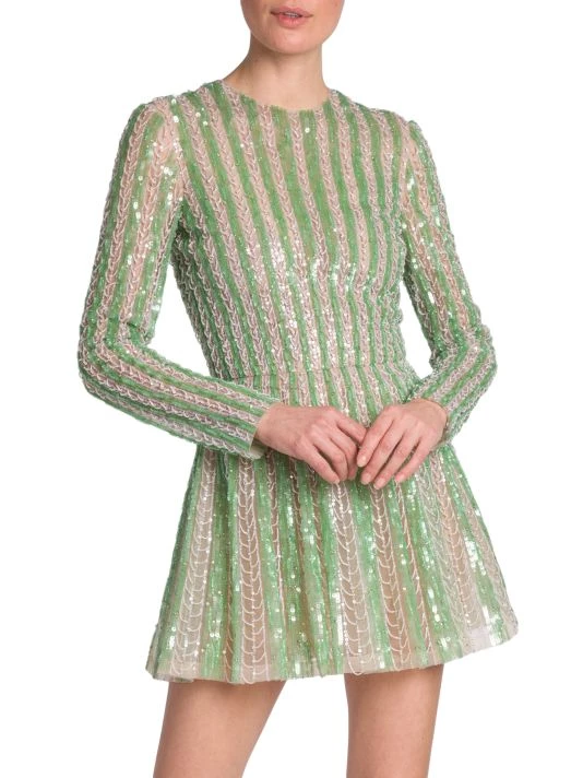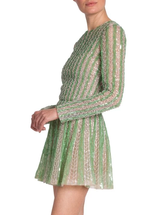 Valentino’s long-sleeve minidress is defined by intricate beaded embroidery and sheer two-tone striping.