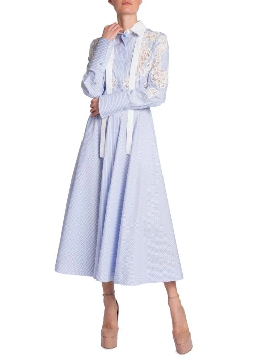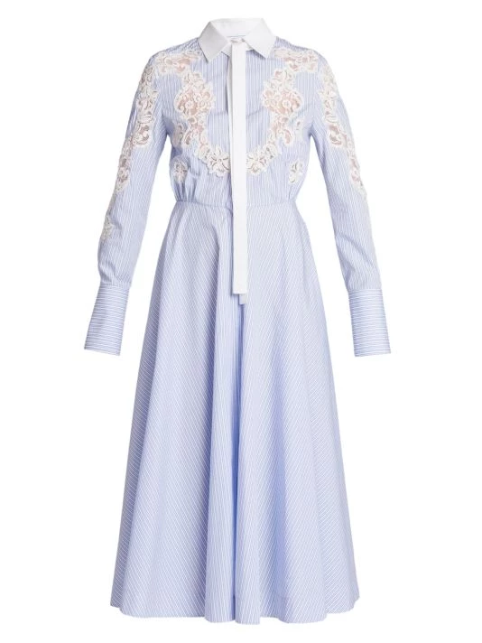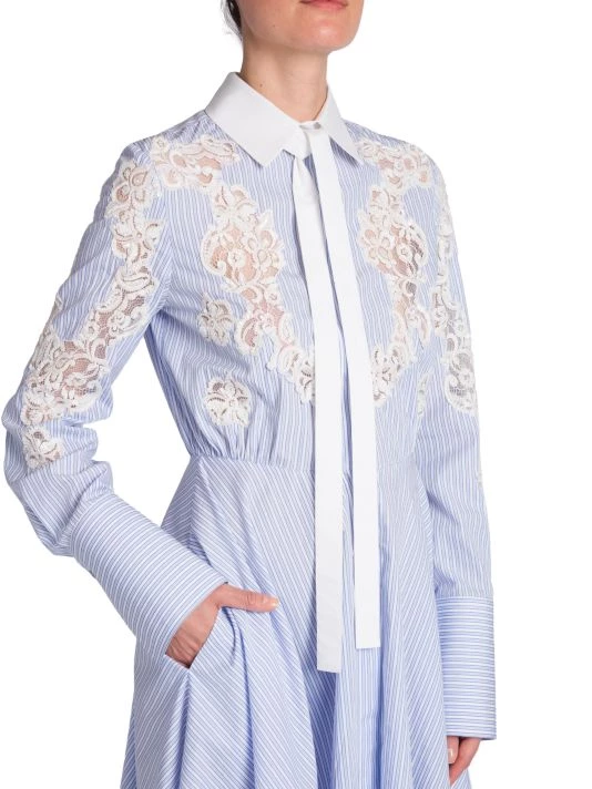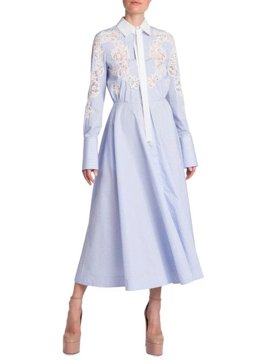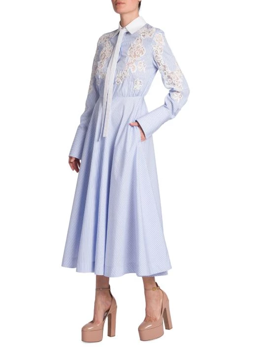 Cut in a shirt-inspired silhouette, Valentino’s striped flared midi-dress is elevated by a self-tie neck and intricate floral lace inserts at the bodice.