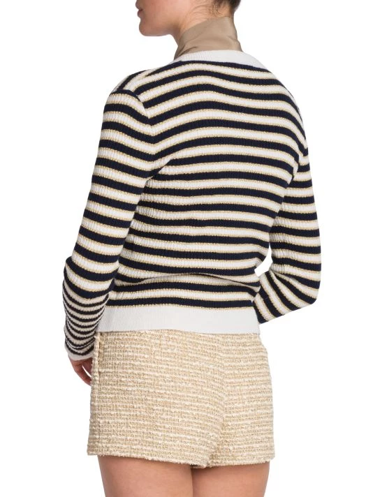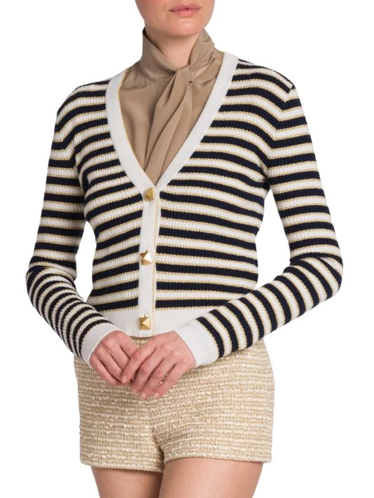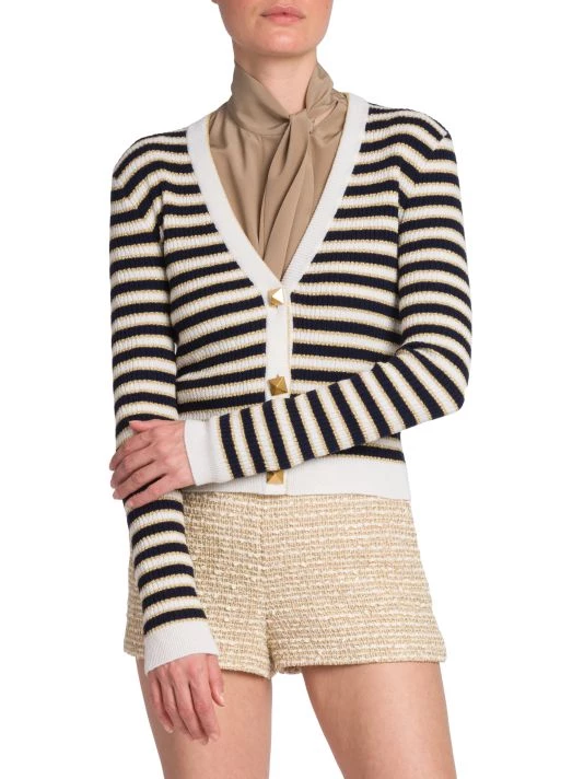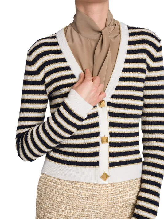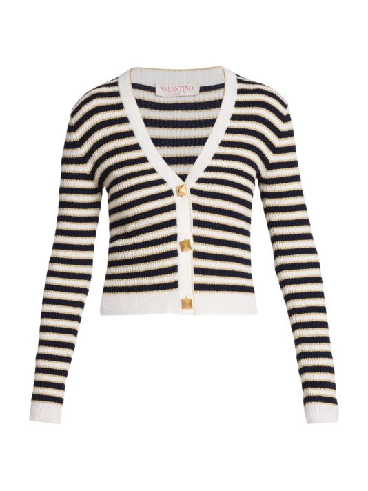 Knit from a wool and cashmere blend, Valentino’s striped cardigan is elevated by a geometric goldtone button front.