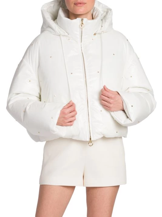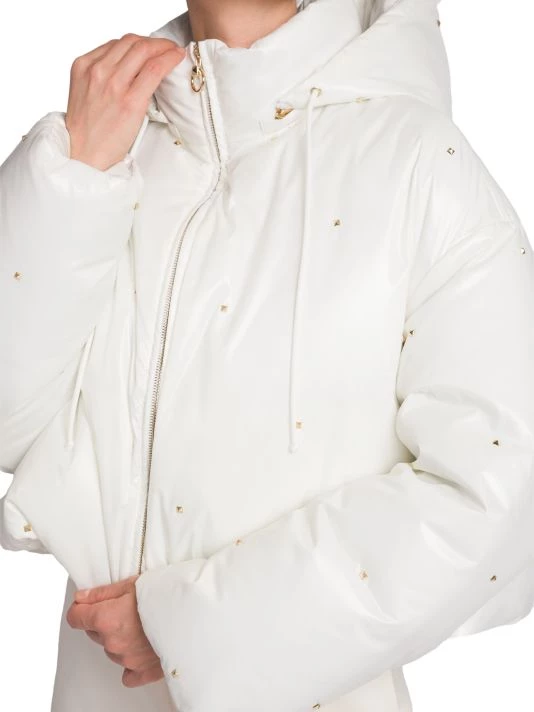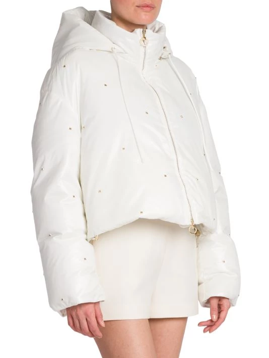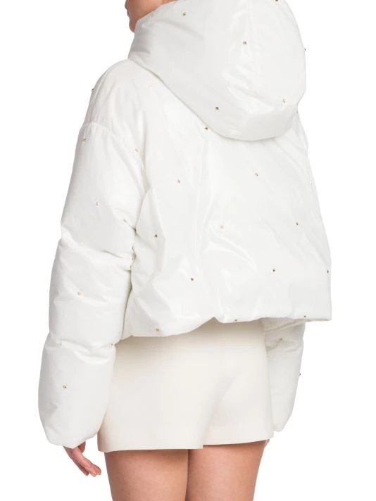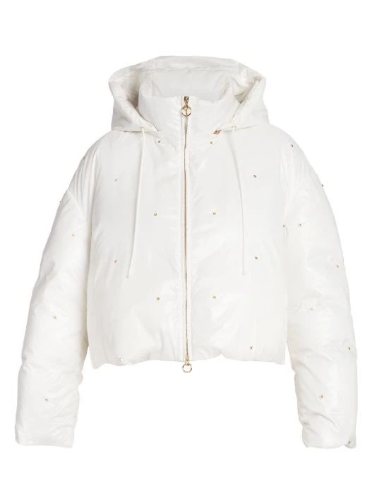 Cut in a cropped silhouette, Valentino’s lustrous nylon puffer jacket is defined by micro geometric goldtone stud embellishments.