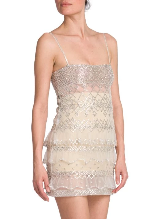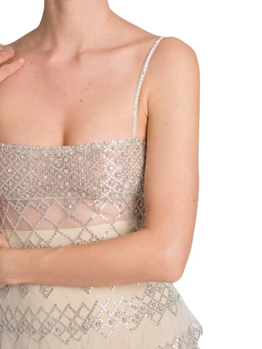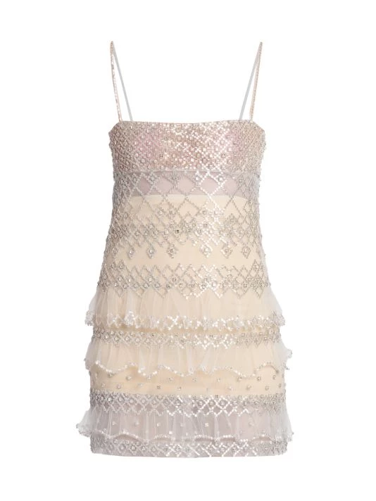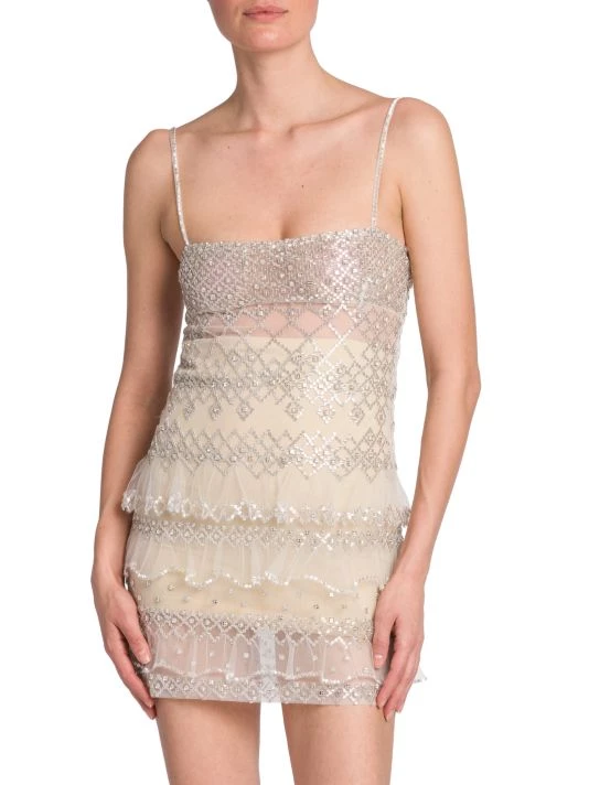 Boasting a slim fit, Valentino’s tiered semi-sheer minidress boasts mixed crystal-embroidered patterning.