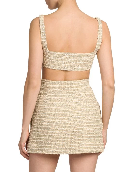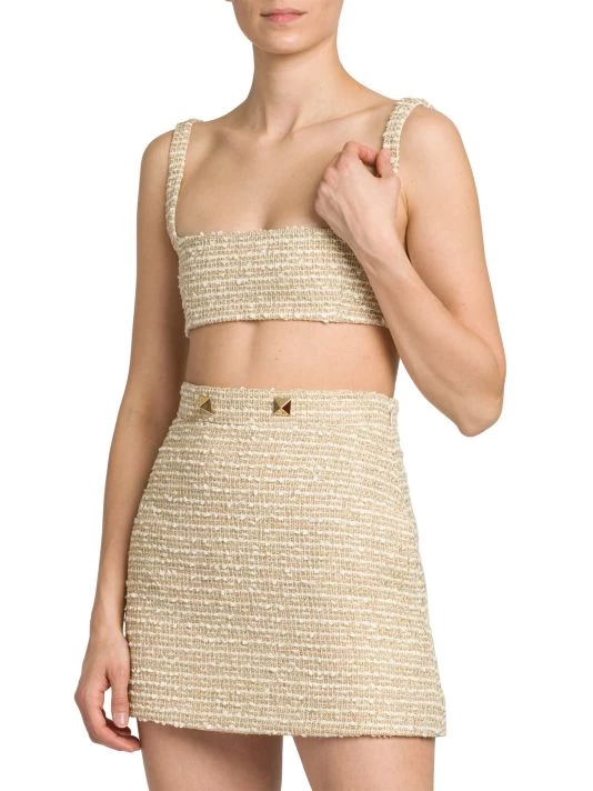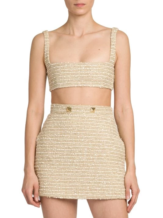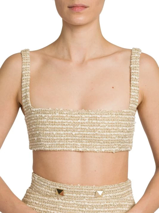 Creative Director Pierpaolo Piccoli’s latest collection expresses a delicate balancing act of furthering the house’s couture legacy with the gen-Z zeitgeist. From an embroidered robe highlighting Valentino’s storied handcraftsmanship to archival prints refreshed for a tracksuit, the visionaire reinvents Valentino hallmarks to “to be relevant for a community of people…who inhabit fashion with an attitude of personal creativity.” This tweed bra top exudes a timeless chic, cut with a deep squareneck and thin straps.