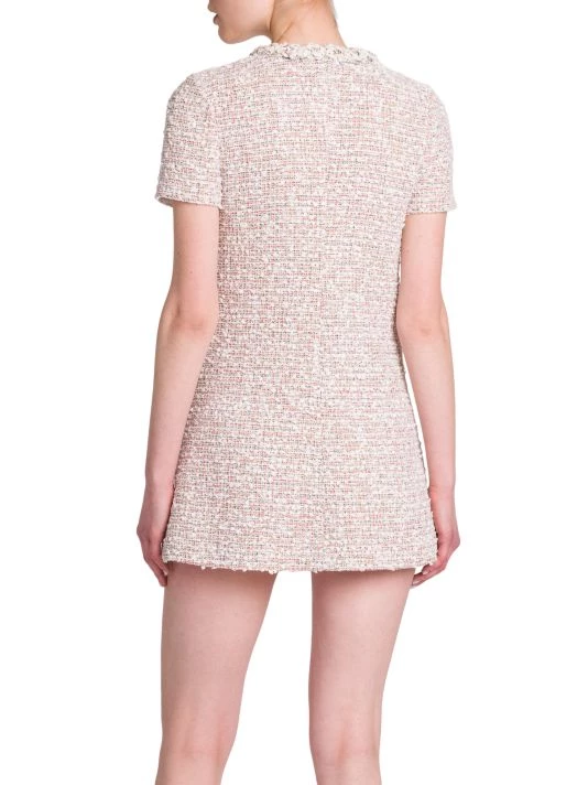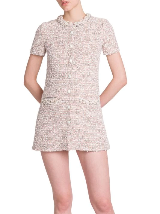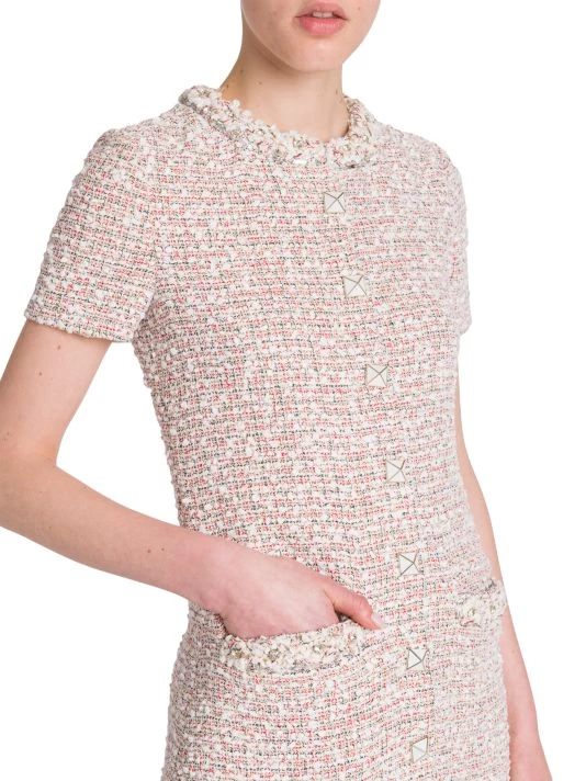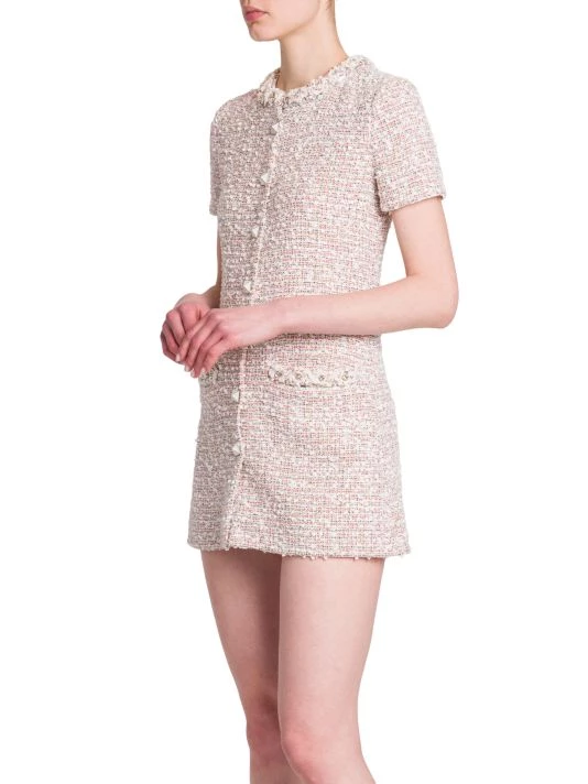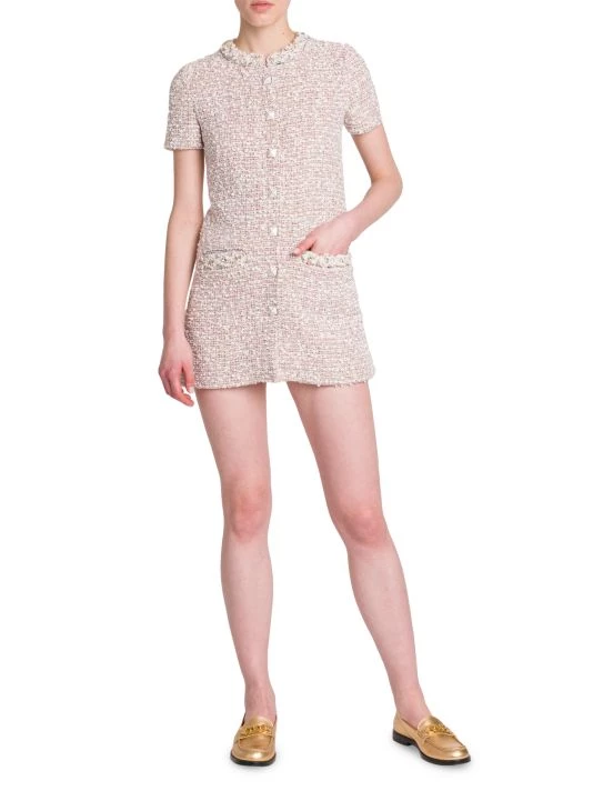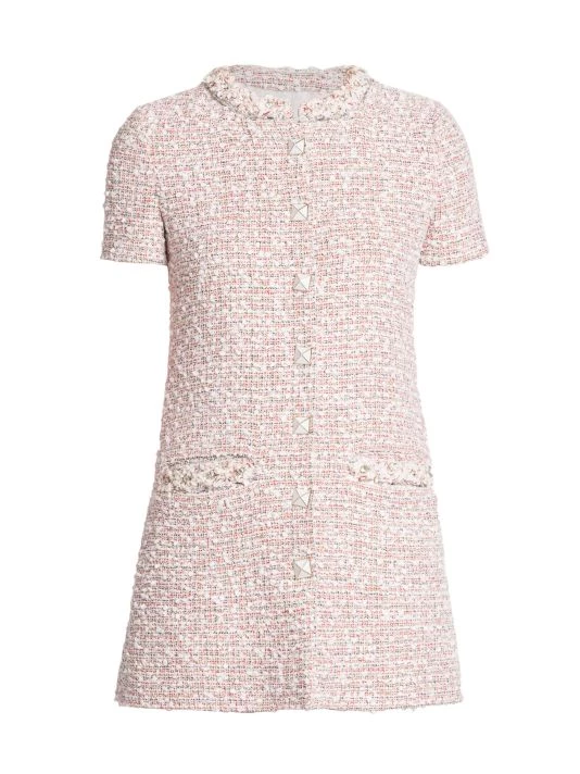 Crafted of tweed, Valentino’s short-sleeve minidress is elevated by a geometric button front and crystal embellishments at the neckline and chest patch pockets.