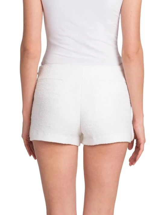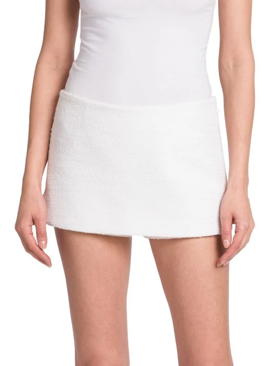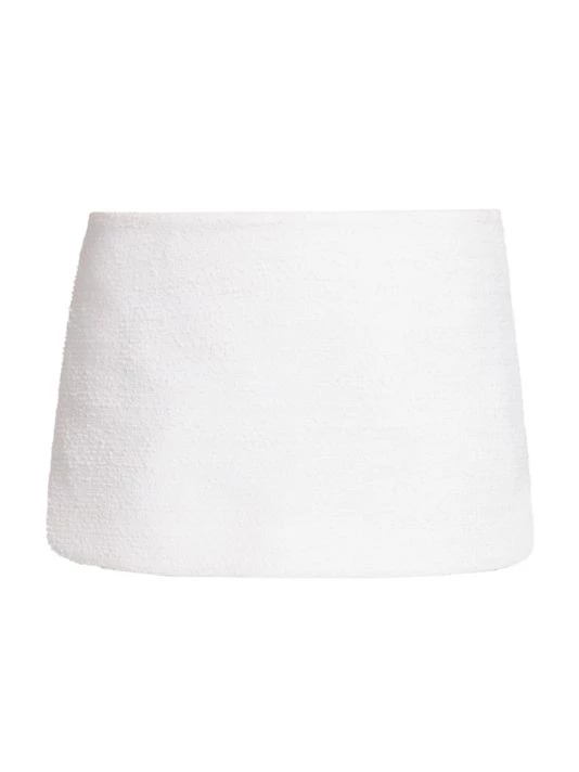 Valentino’s tweed mini-skirt boasts a layered round hem and dimensional split sides.