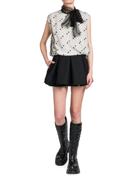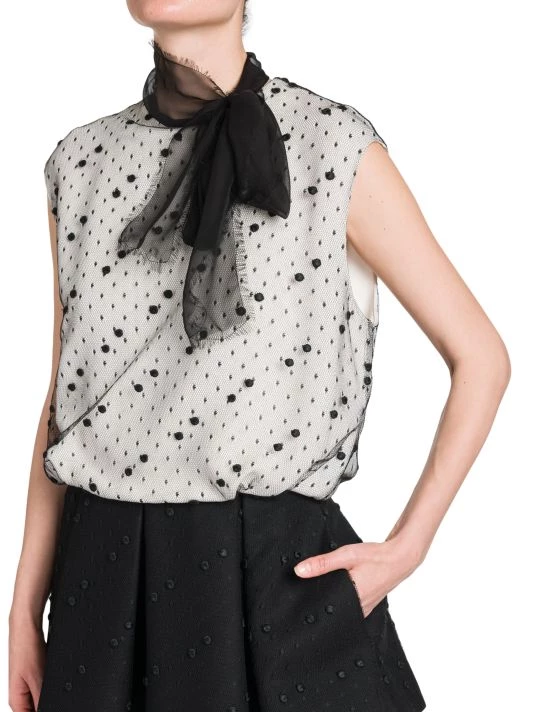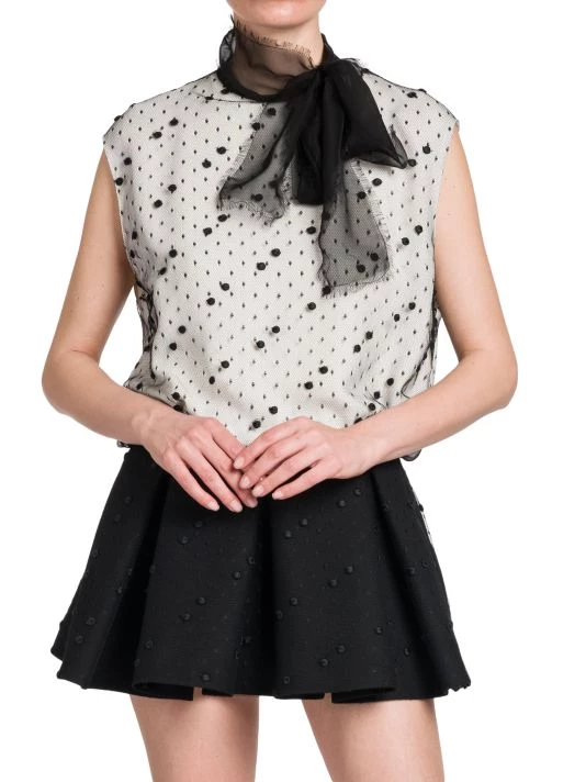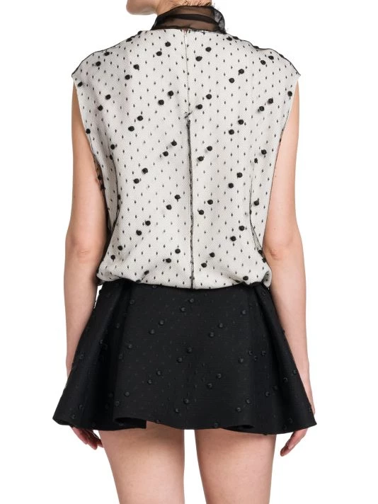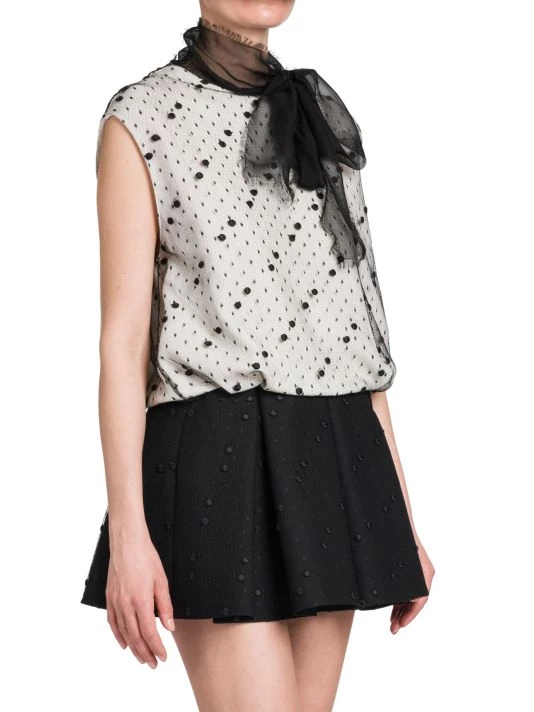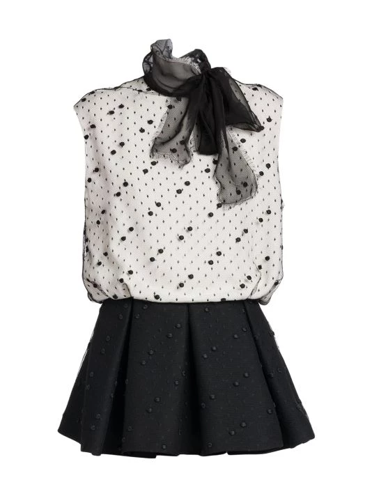 Mesh polka dot mini-dress with a self-tie neck and contrast pleated skirt.