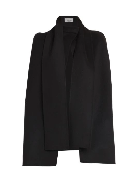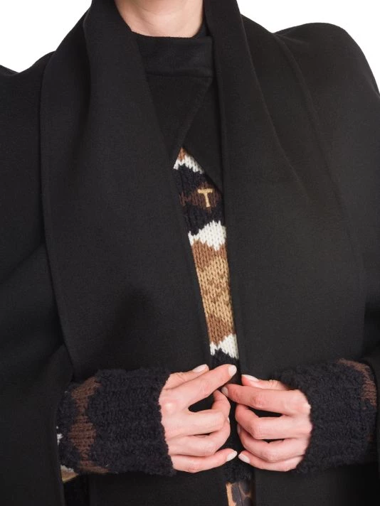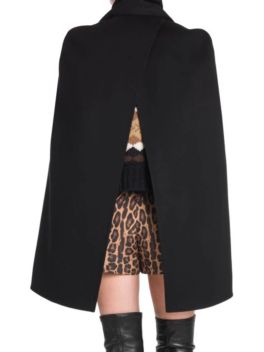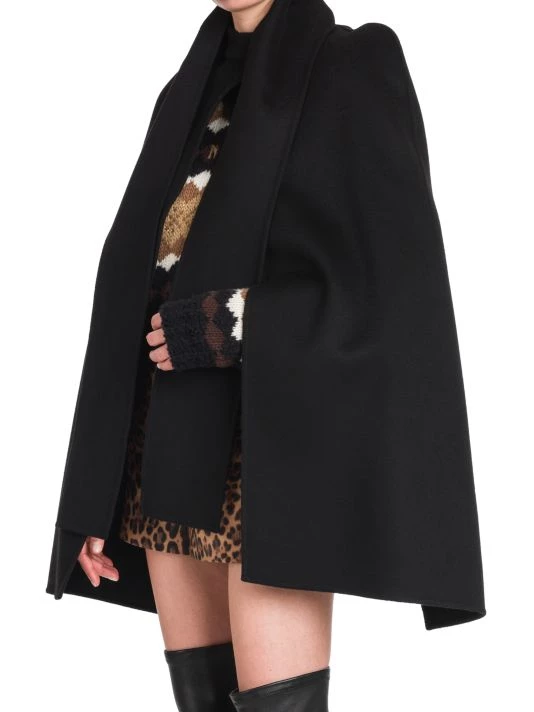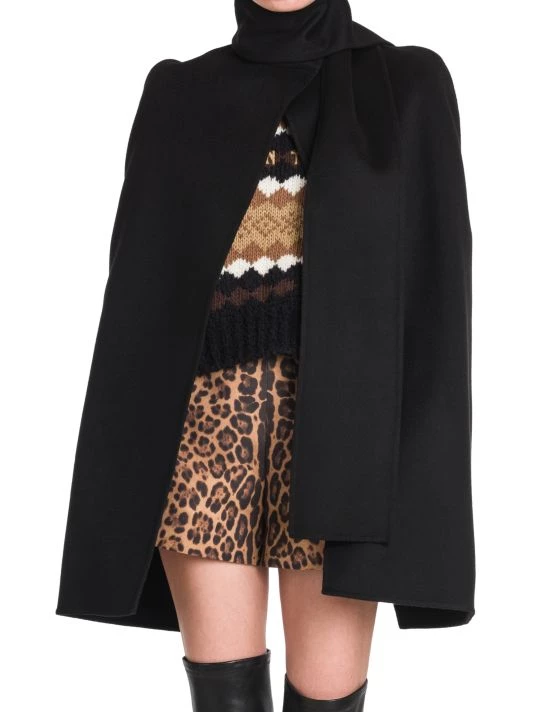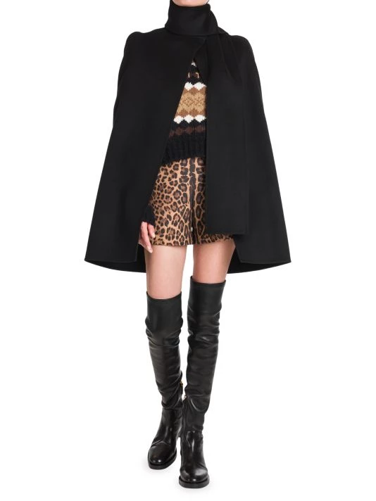 Virgin wool cape with defining puff shoulders and a convertible turtleneck to fasten.
