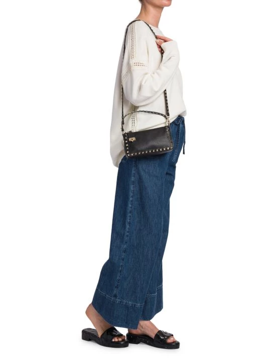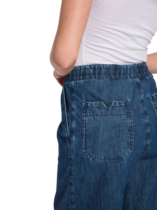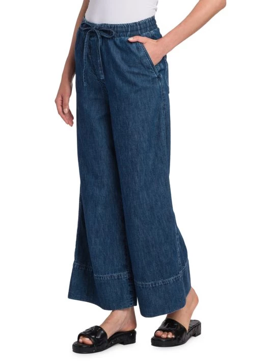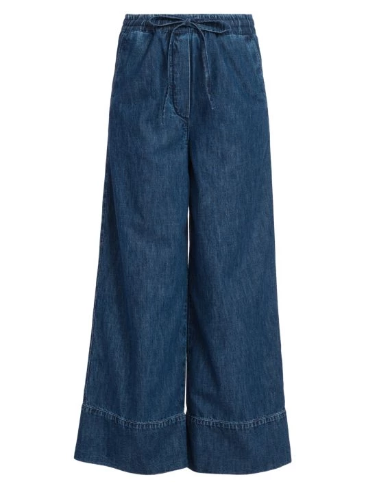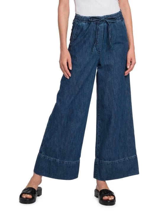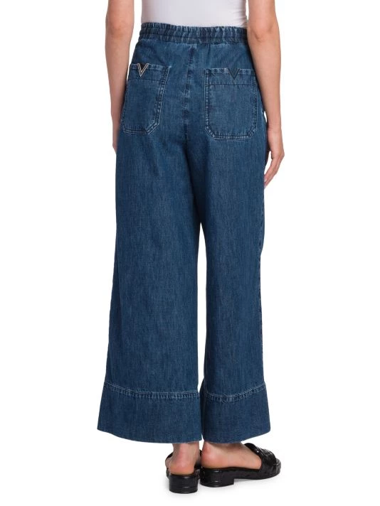 Wide-leg denim pants with a comfort elasticized waist and tonal metal branding at back patch pockets.